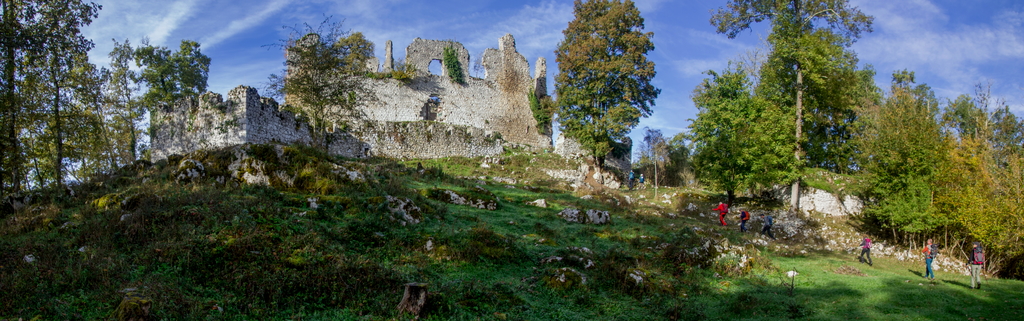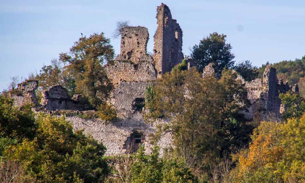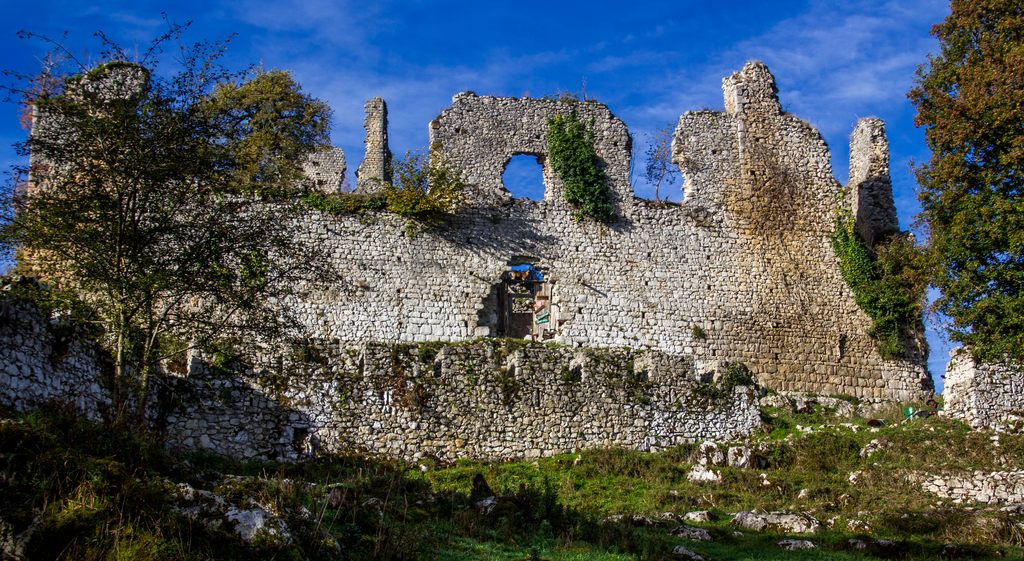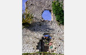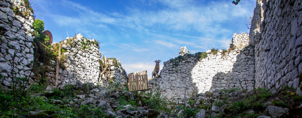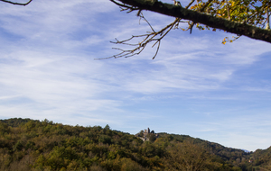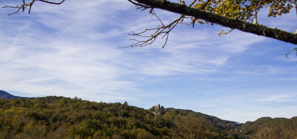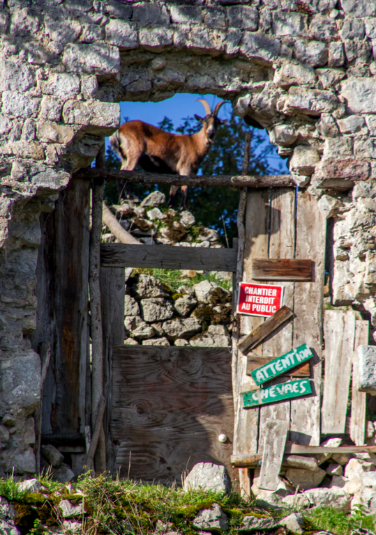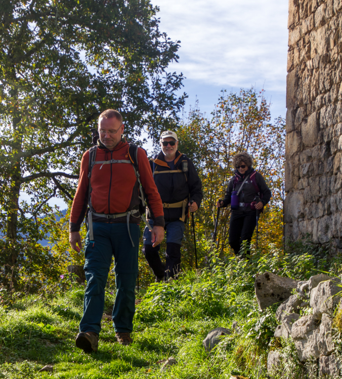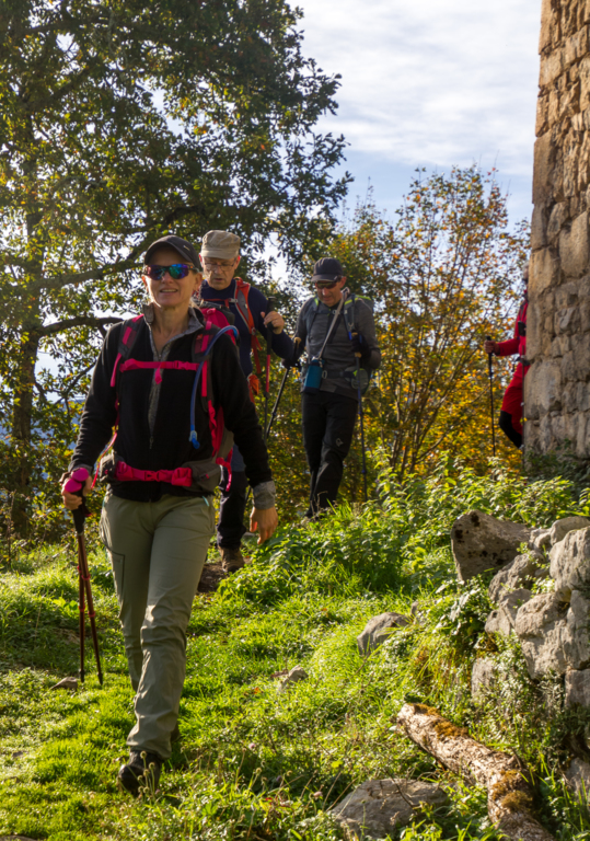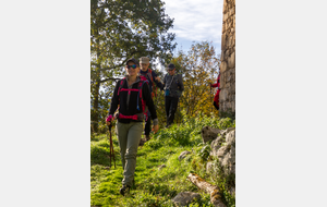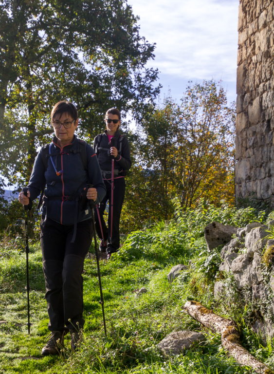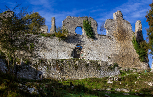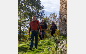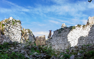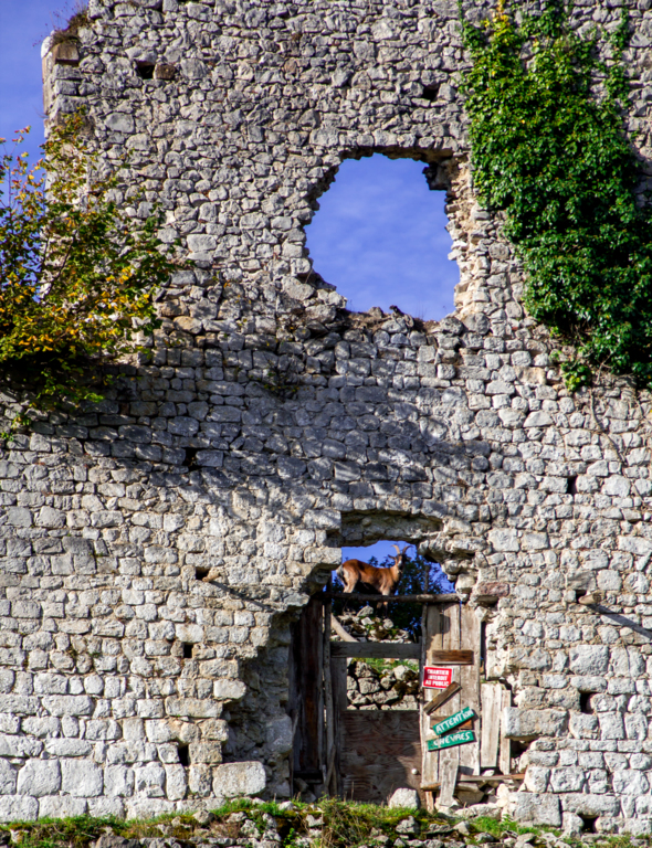 Montée rapide jusqu’aux ruines du Château St Barthélémy (XIe siècle) gardé par des chèvres.