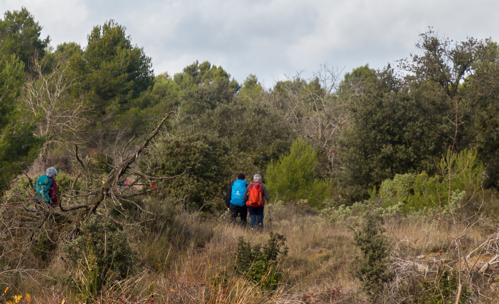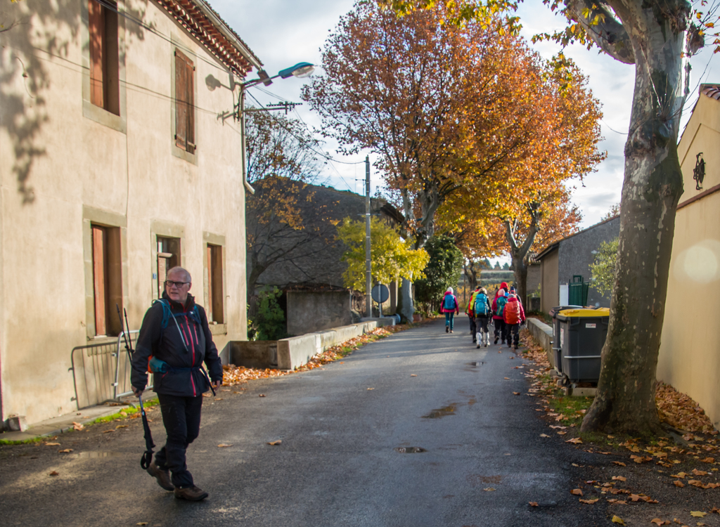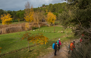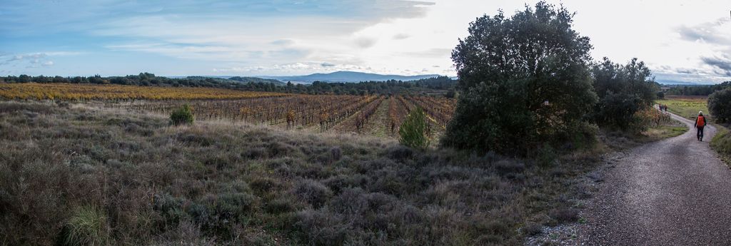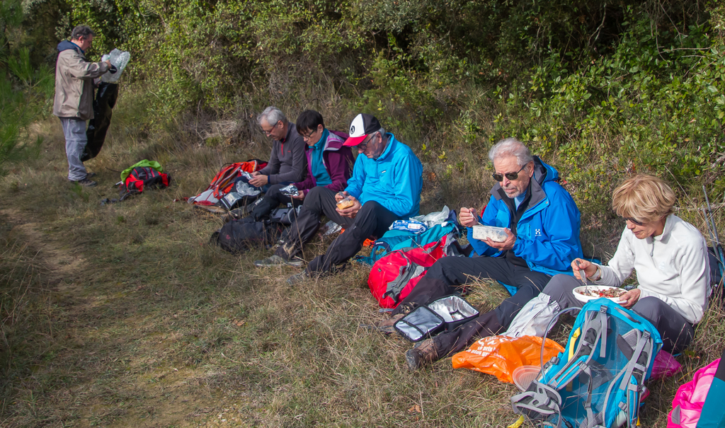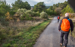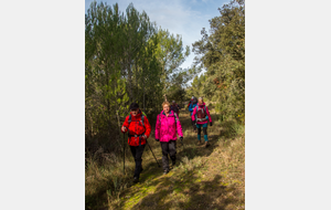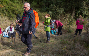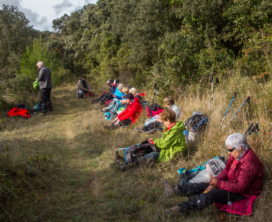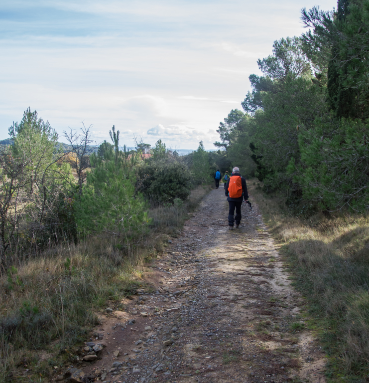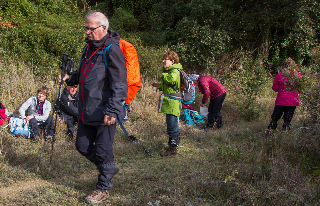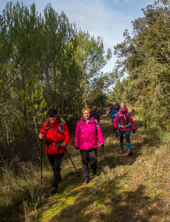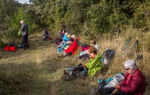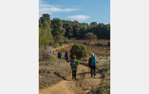 Jeudi 28 novembre 2019 Laure-Minervois – Entre garrigues, pinèdes, vignobles et capitelles (Aude) Le temps très pluvieux au point de rendez-vous Unionais nous a amené à changer de cap. Direction l’Aude (au lieu de St Antonin Noble Val - 82) pour rejoindre Laure-Minervois sous la pluie. Arrivée au point de départ de notre randonnée les quelques dernières gouttes sont chassées par le vent de Nord-Ouest (Cers) qui se lève. Temps doux, humide et nuageux devenant plus frais mais ensoleillé en fin de matinée sous l’effet du vent . Dès la sortie du village, traversée de vignoble et montée dans une pinède à proximité des Bentoulades puis du Galabru et du Garrigot .Découverte des premières capitelles (abris ouvriers en pierre sèches). Passage aux milieux de vignes en surplomb de Laure-Minervois avec vue sur les Pyrénées Catalanes embrumées. Arrivée dans une zone de loisirs avec une belle retenue d’eau alimentée par les ruisseaux de l’Escure et des Palats. Poursuite entre vignes et garrigues en alternance jusqu’à Métairie Neuve. Traversée ensuite de la pinède La Crémade puis d’un vaste vignoble avant d’aboutir aux fouilles exhumées d’un cimetière de Wisigoths. Boucle de retour sur Métairie Neuve à travers de belles garrigues, passage sur le ruisseau de La Grand-Combe (à sec) avant la pause repas à l’abri du vent. Après la traversée de Métairie Neuve et quelques vignes, retour dans des pinèdes, celles de Pech Majou avec plusieurs capitelles, mais aussi des dizaines de cèpes des pins après les ceps de vignes! Fin de parcours avec belles vues sur la plaine de Carcassonne et Trèbes, la Montagne d’Alaric et le village de Laure-Minervois.