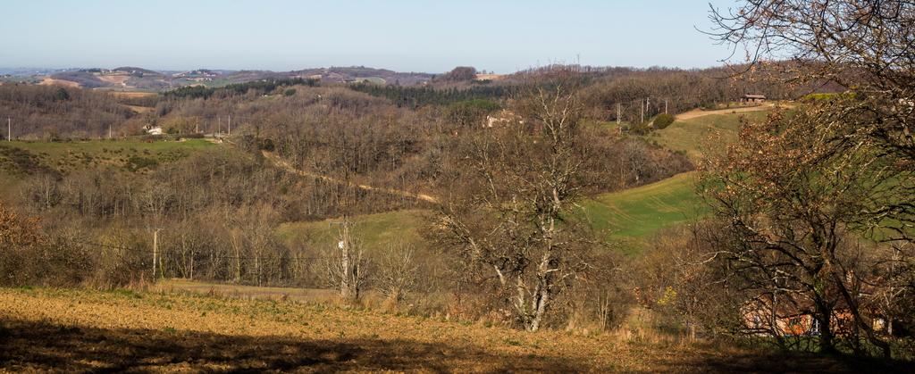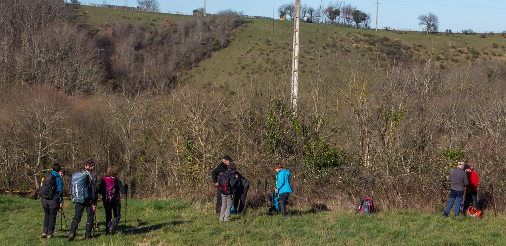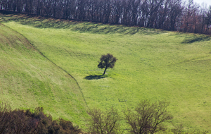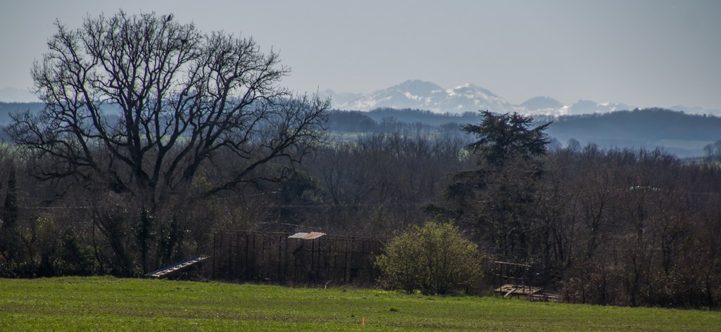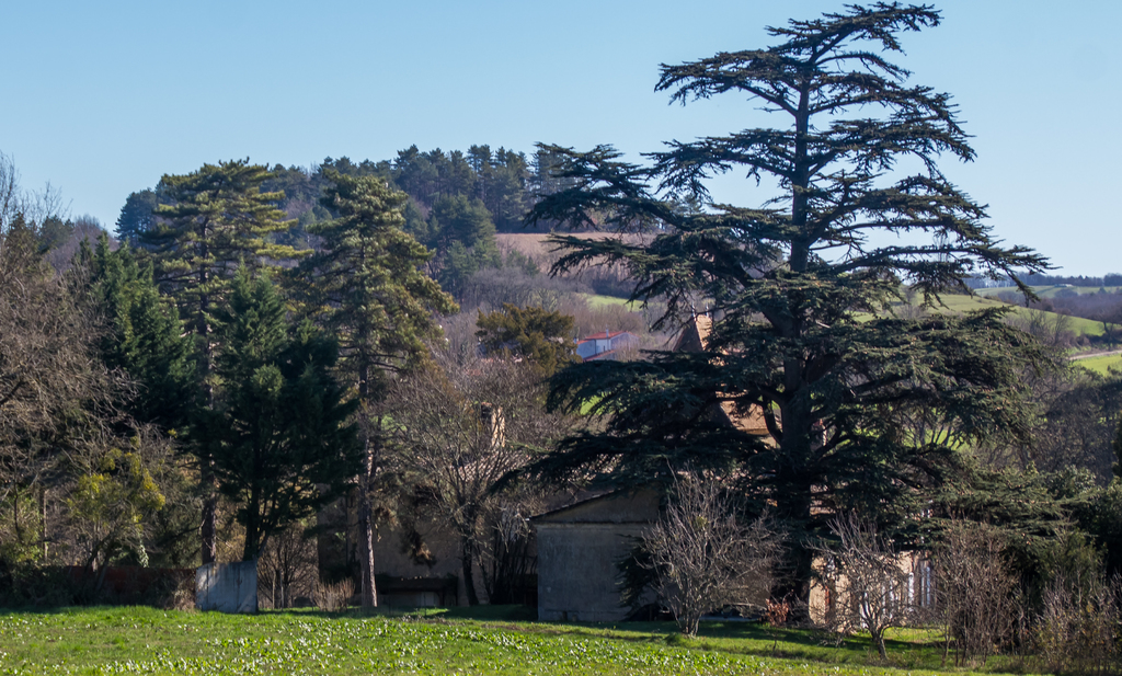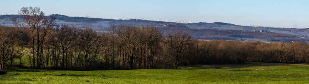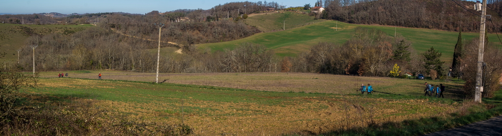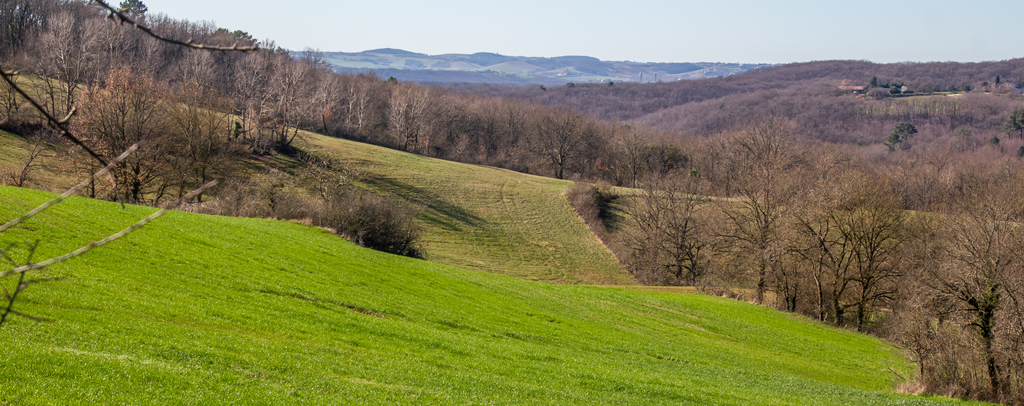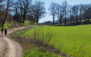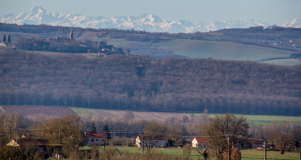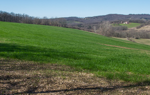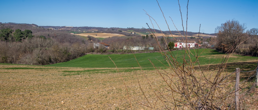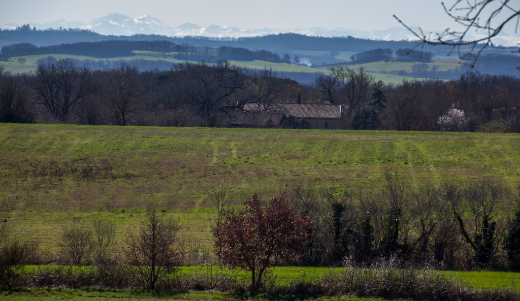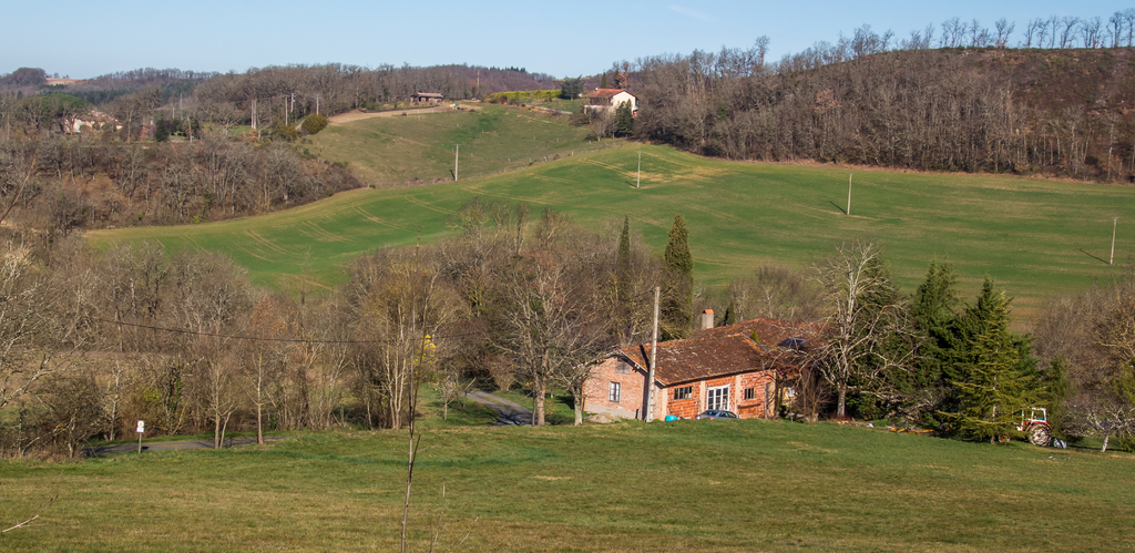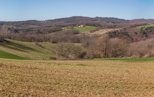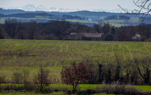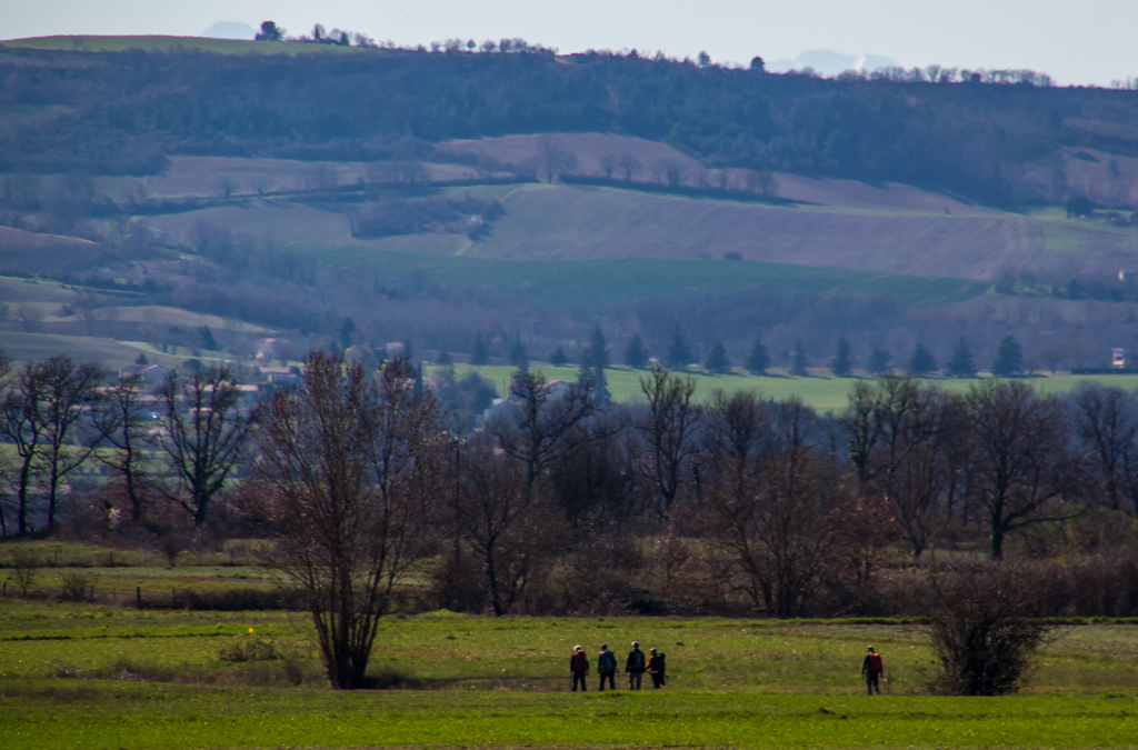 Descente en bordure du Bois de La Capelle et dans le Bois de La Brunié. Belle demeure et beau pigeonnier à La Brunié. Traversée de la D84 puis passage du ruisseau de Guinet direction En Auriol. Passage au milieu de champs de cultures céréalières avec leur vert tendre printanier avant la pause repas dans le bois En Rel. Direction ensuite Le Rious, Pendarel, La Maison Neuve, Le Genèvrier et la plaine de Vialas (nouvelle vue sur les Pyrénées) avant de pénétrer dans le bois de La Masiè.