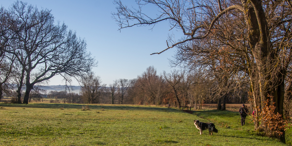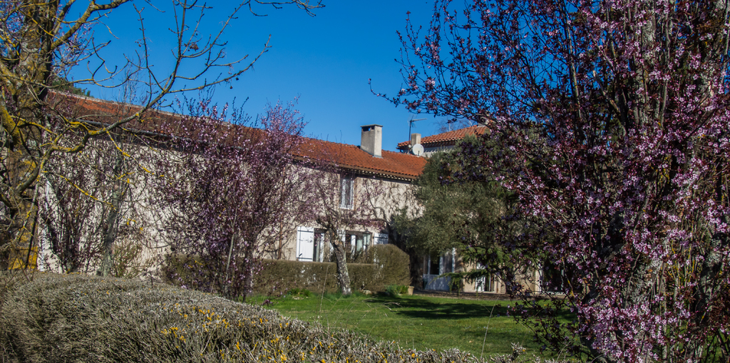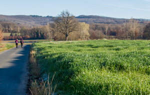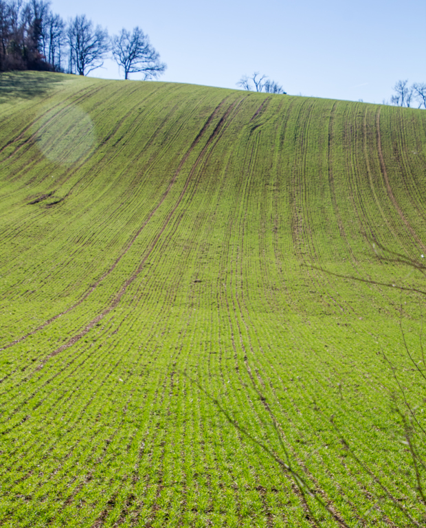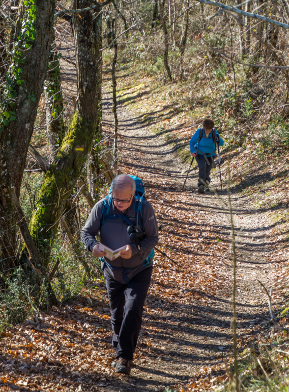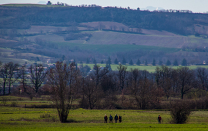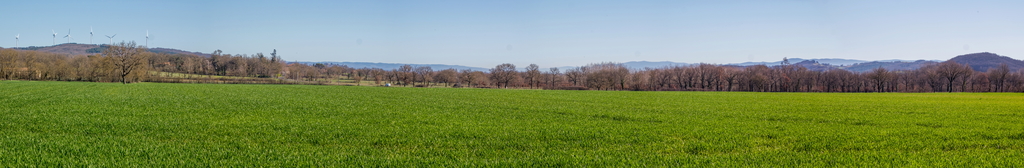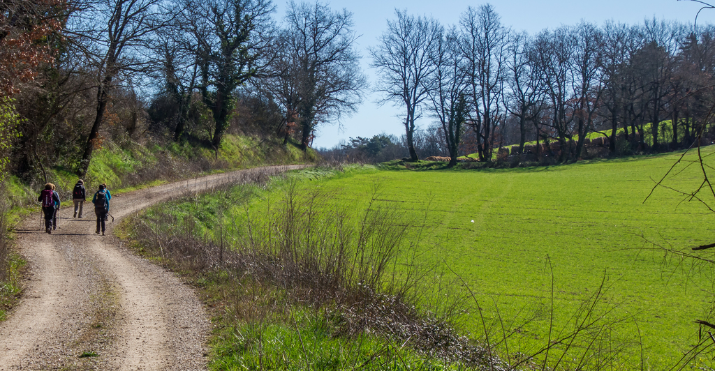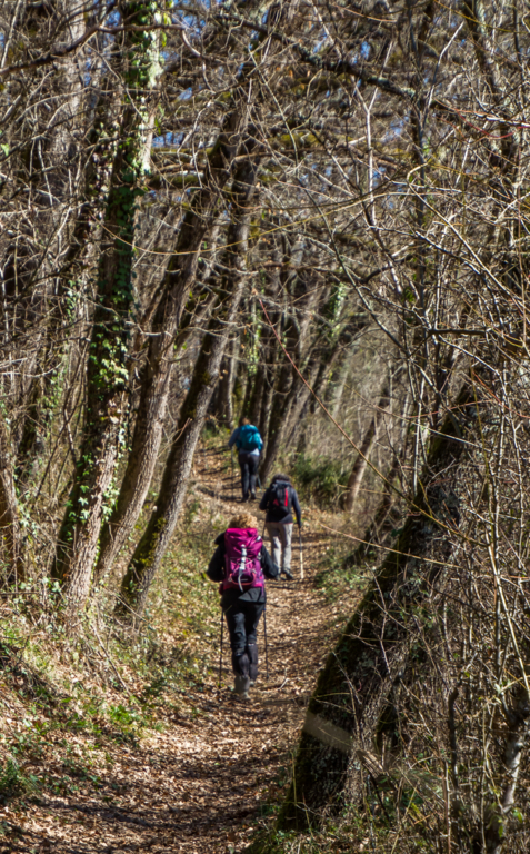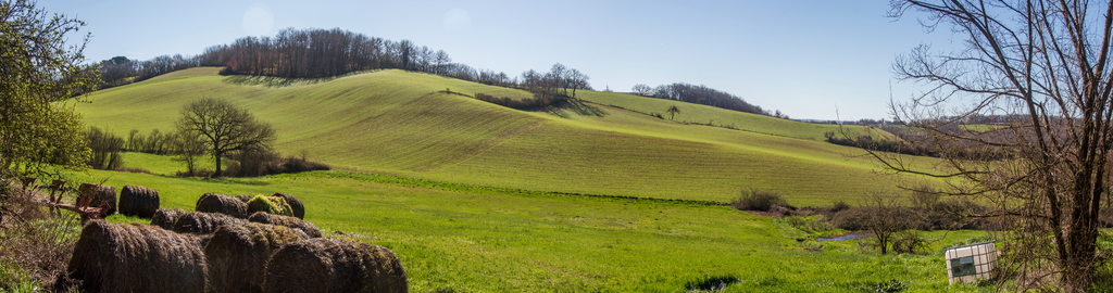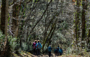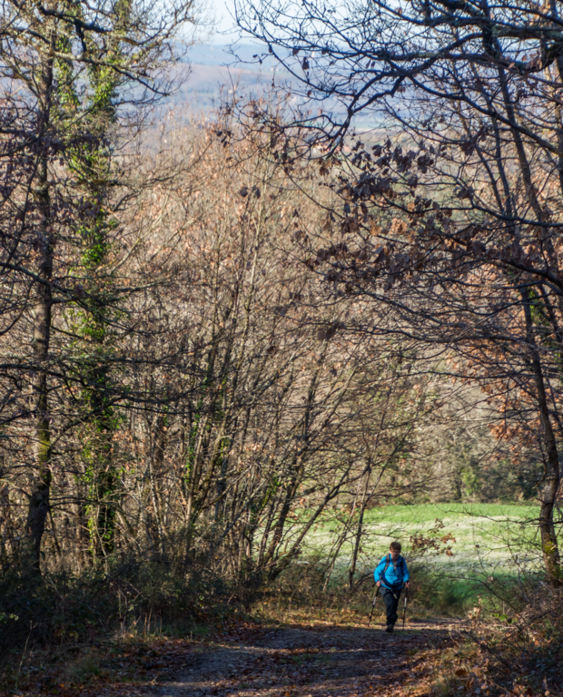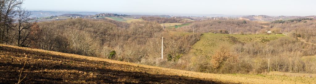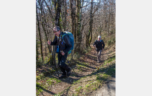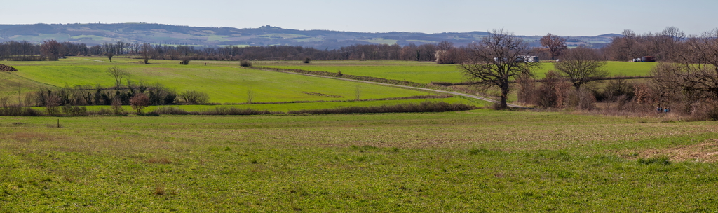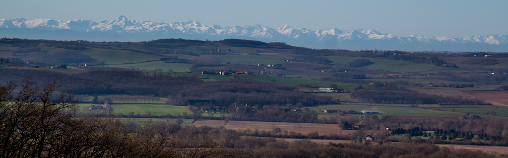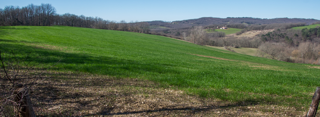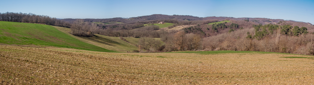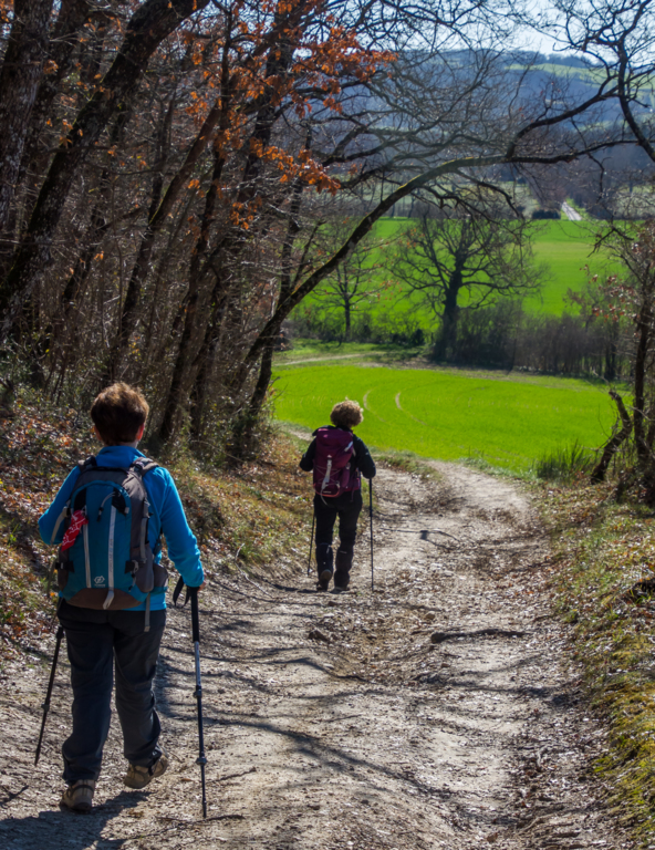 Descente en bordure du Bois de La Capelle et dans le Bois de La Brunié. Belle demeure et beau pigeonnier à La Brunié. Traversée de la D84 puis passage du ruisseau de Guinet direction En Auriol. Passage au milieu de champs de cultures céréalières avec leur vert tendre printanier avant la pause repas dans le bois En Rel. Direction ensuite Le Rious, Pendarel, La Maison Neuve, Le Genèvrier et la plaine de Vialas (nouvelle vue sur les Pyrénées) avant de pénétrer dans le bois de La Masiè.