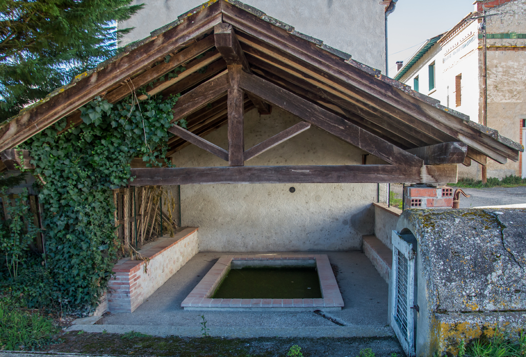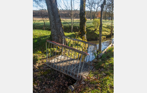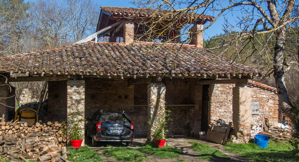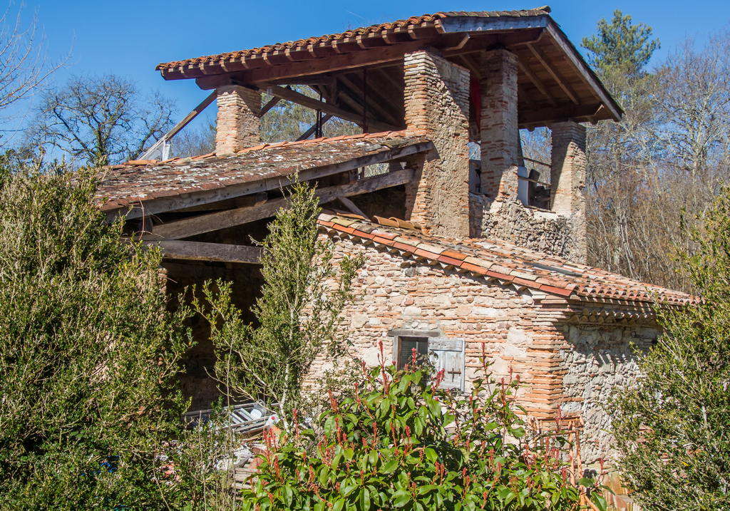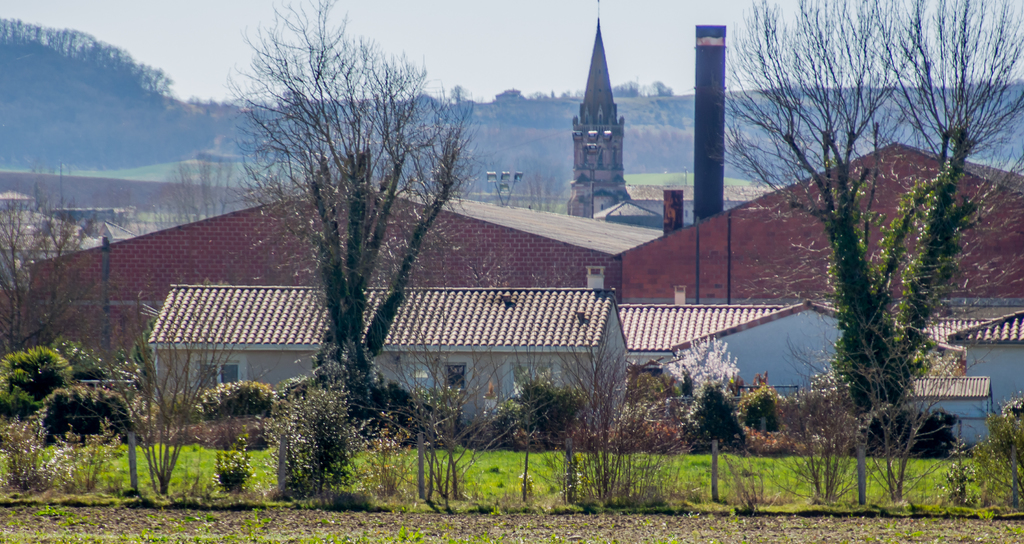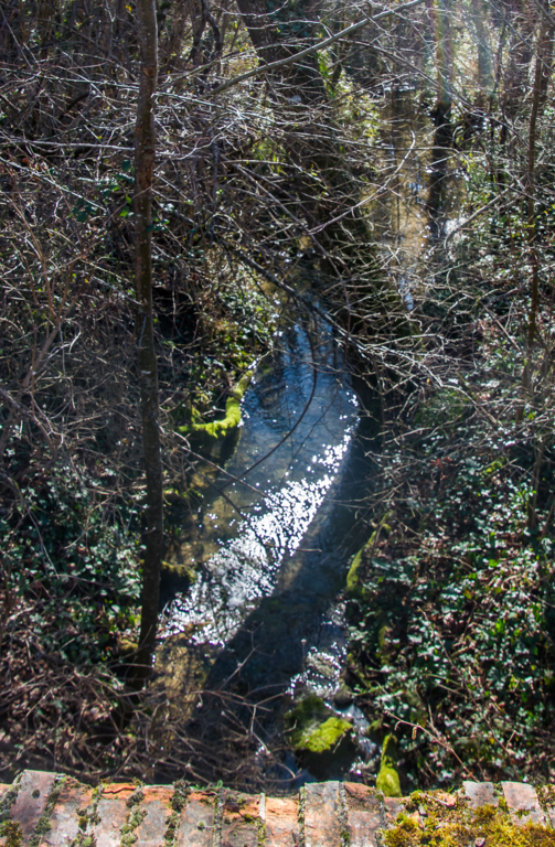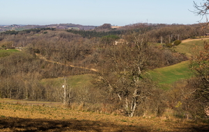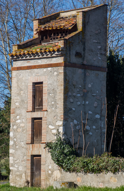 Passage du pont du ruisseau de Lézert pour arriver au hameau de Beauzèle (pigeonnier). Vue sur la tuilerie de Damiatte et l'église de St Paul-Cap-de-Joux.