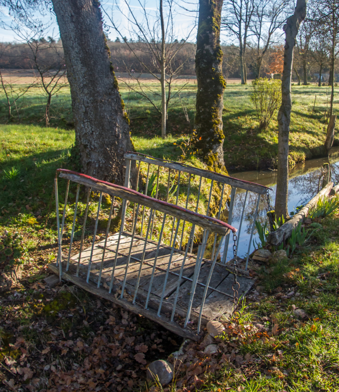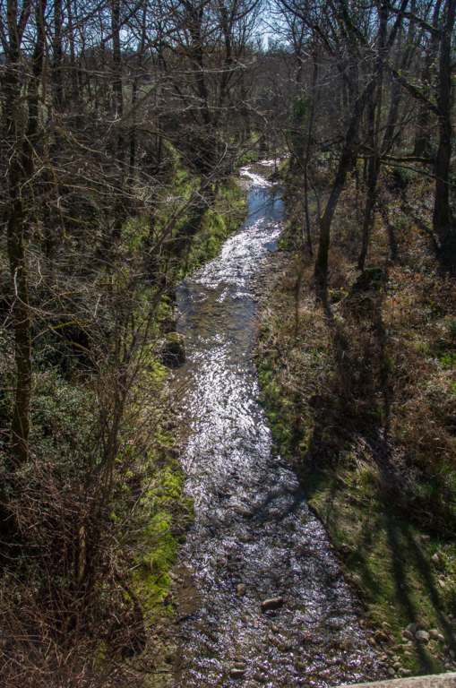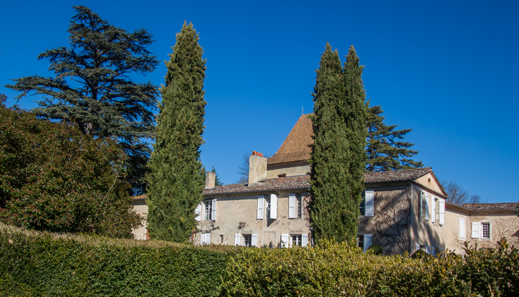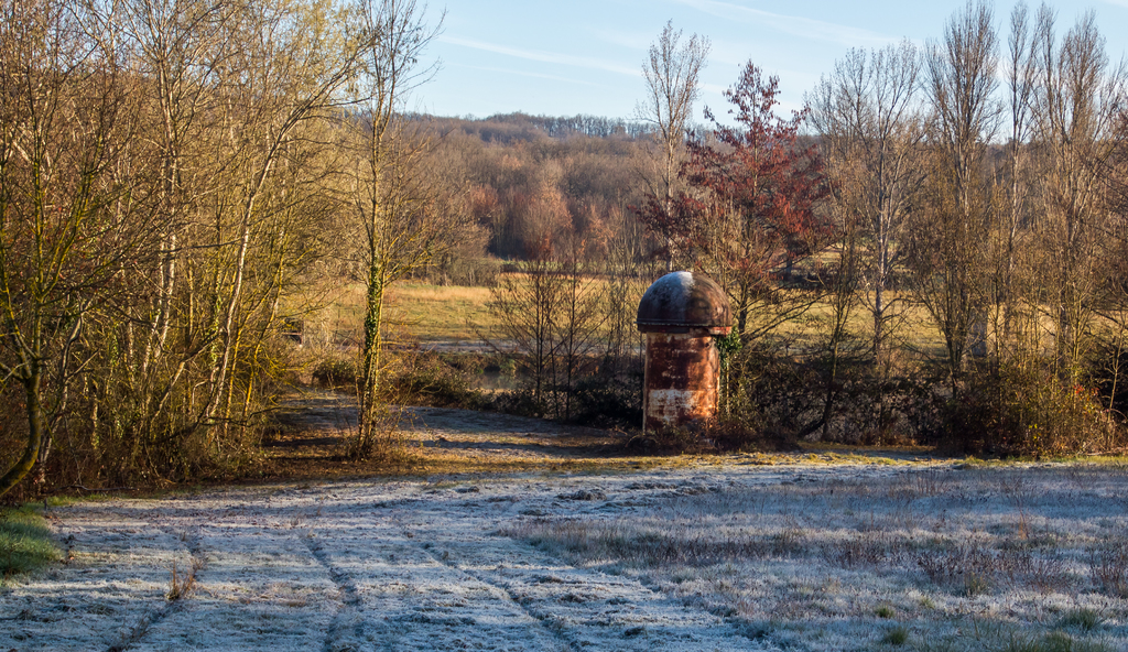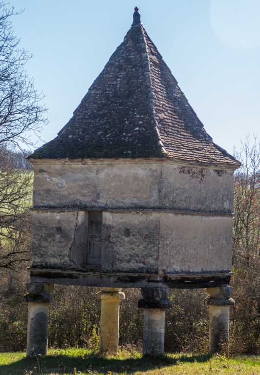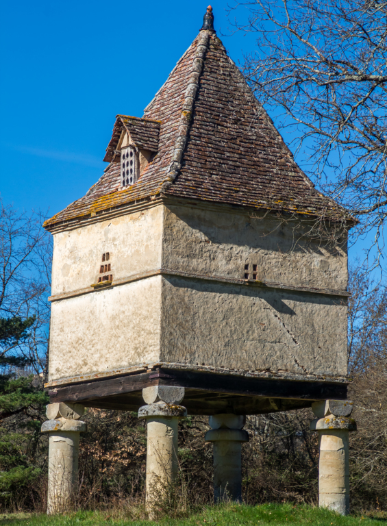 Passage du pont du ruisseau de Lézert pour arriver au hameau de Beauzèle (pigeonnier). Vue sur la tuilerie de Damiatte et l'église de St Paul-Cap-de-Joux.