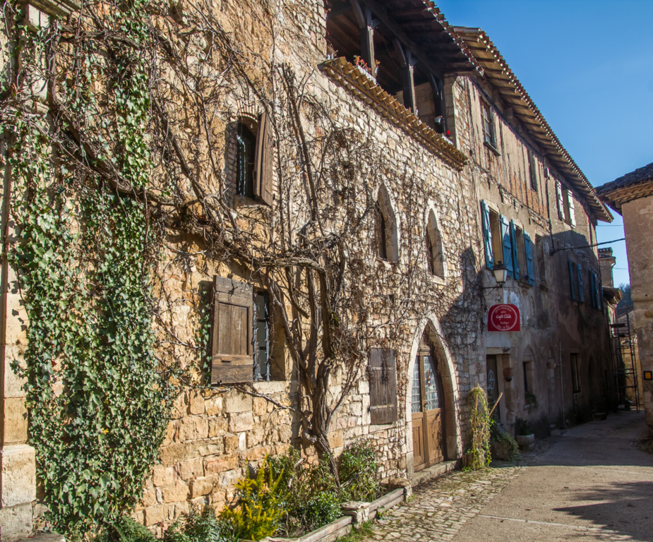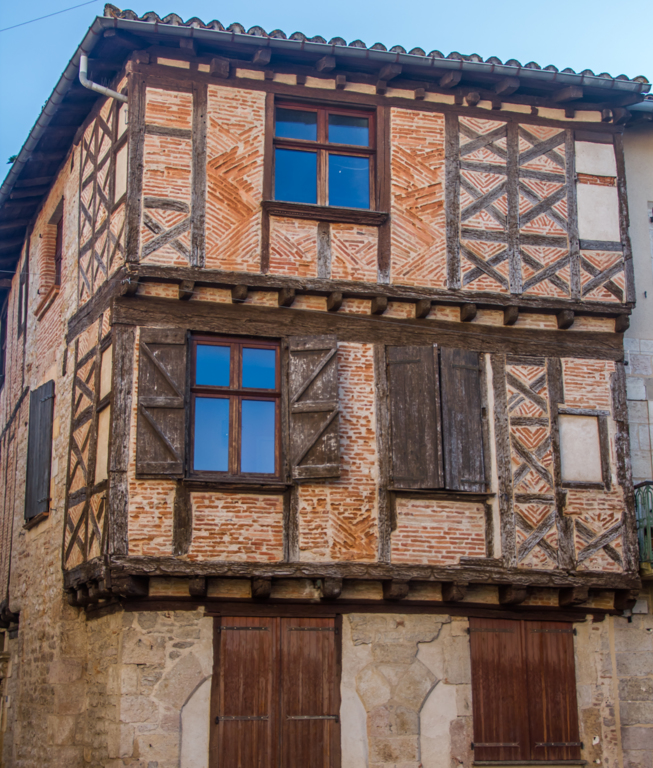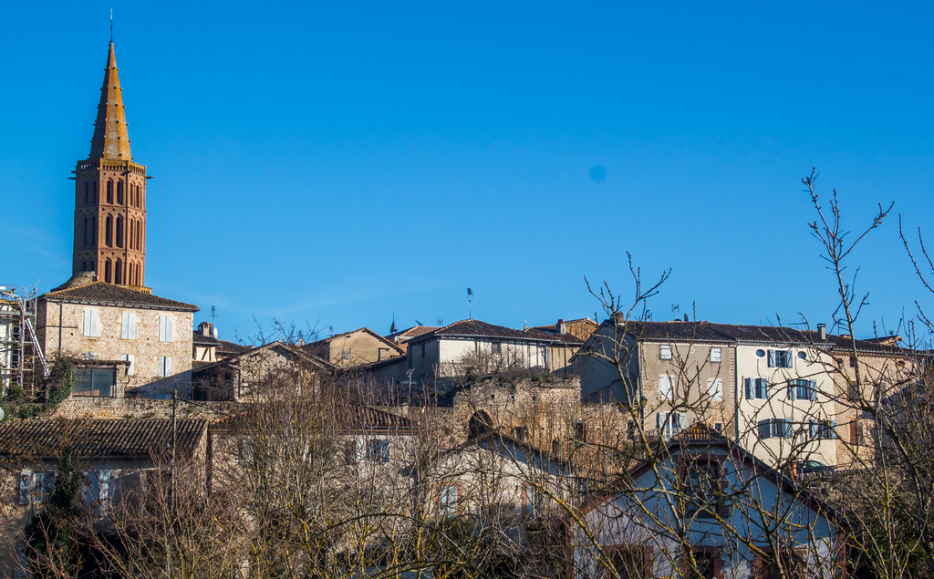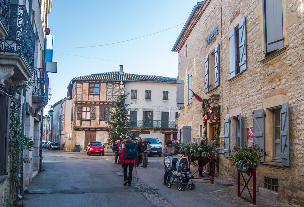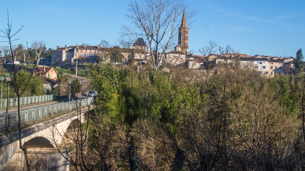 Traversée de l'Aveyron et visite de Montricoux, village pittoresque fortifié sur les bords de l'Aveyron dont les ruelles sont bordées de maisons médiévales à colombage et