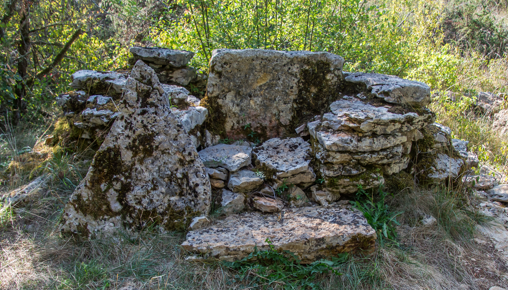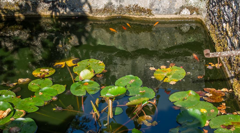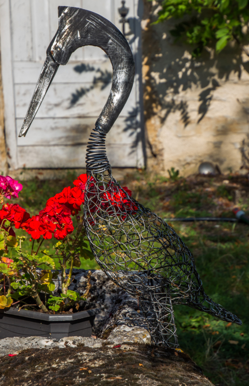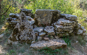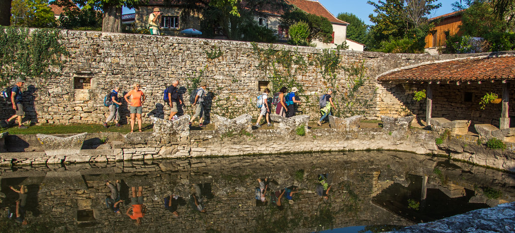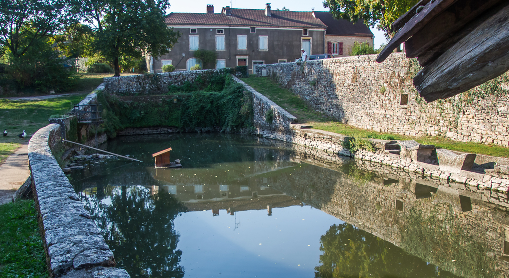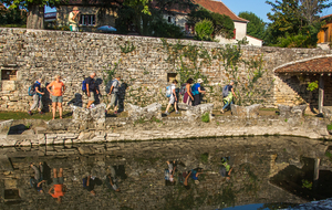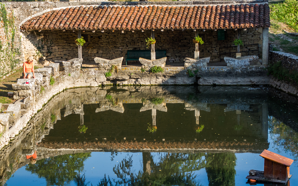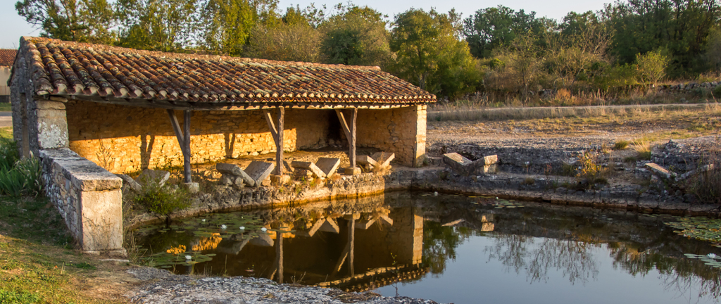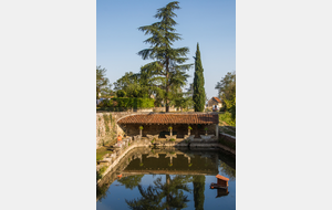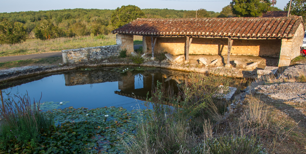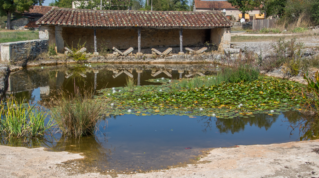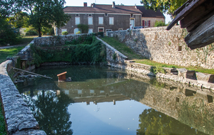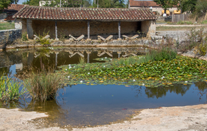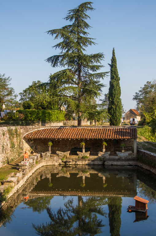 En contrebas du village, passage autour du lavoir papillon. Ce vaste bassin fut longtemps le lieu le plus animé du village. Bassin de pierre avec la pompe à bras pour l’eau à boire, son abri à lavandières pour le soleil et pour la pluie, et ses beaux papillons de pierre en attente de coups de battoir !