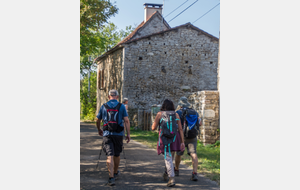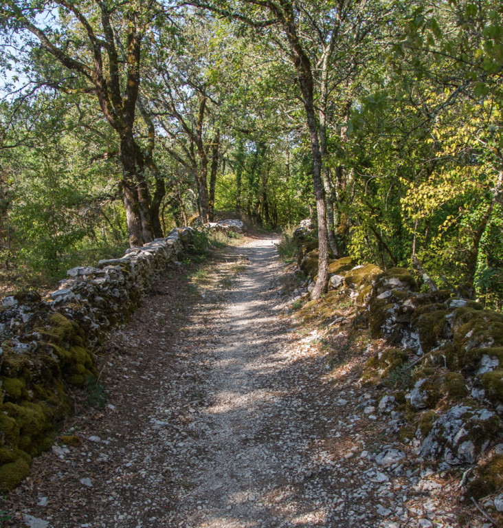 Sortie du village direction le hameau des Escoutilles pour prendre une partie commune à trois GR 36, 46, 65 (fraction du chemin de St Jacques de Compostelle dans le Causse de Limogne)