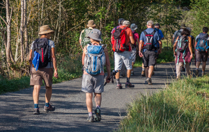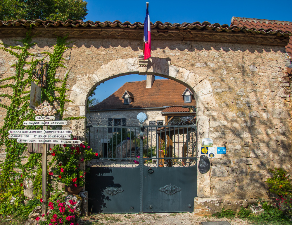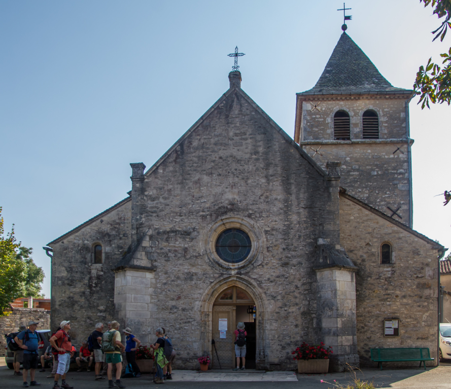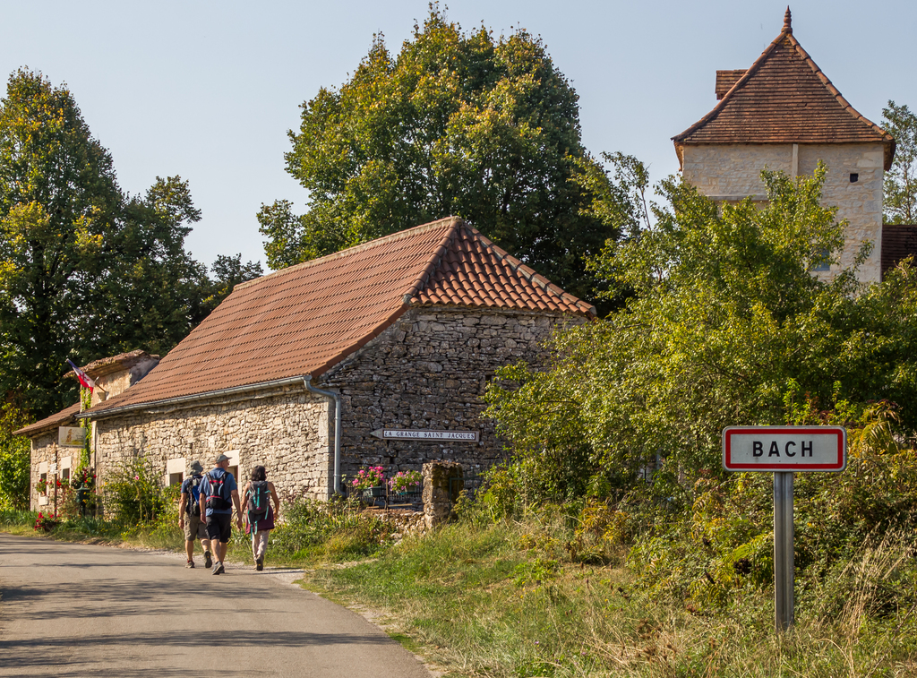 Entrée dans Bach avec passage devant une belle halte pour des pèlerins puis arrêt dans le village devant l'Église Notre-Dame de l'Assomption.