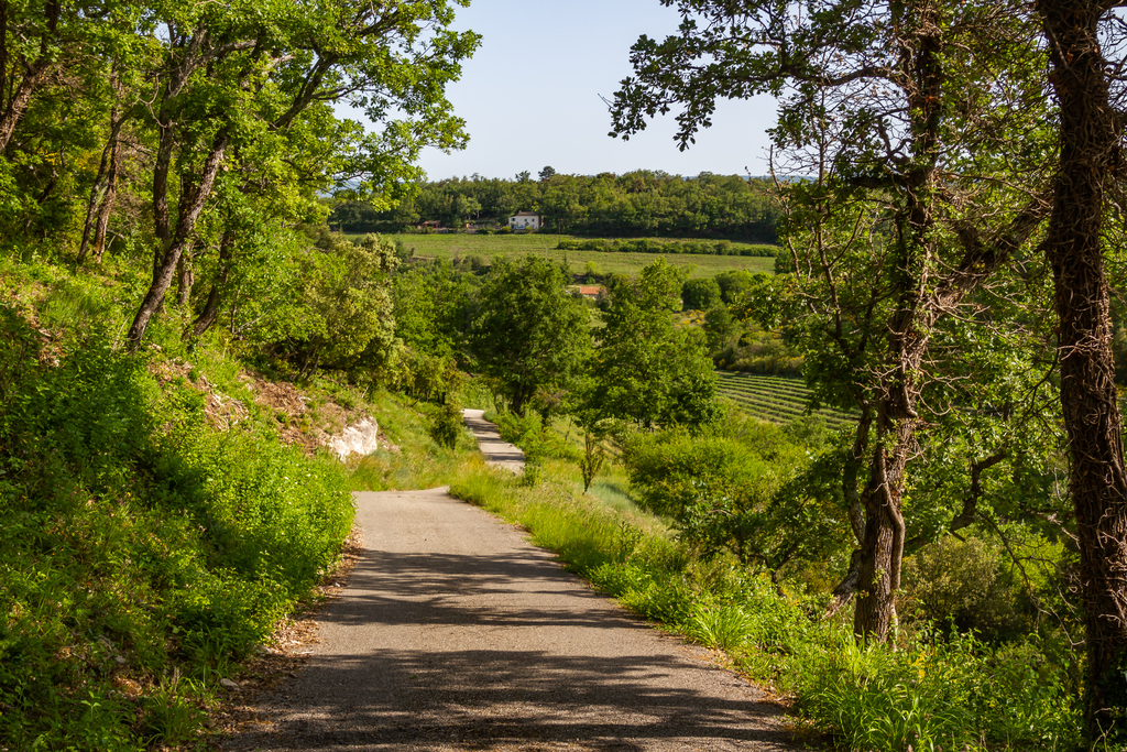 Départ parking à la sortie d’Auribeau sur la D48 jusqu’à Bergeroux au point 598 m pour retrouver la D48 au point 620 m "Chemin de la Française" jusqu’aux Fondons (615 m).