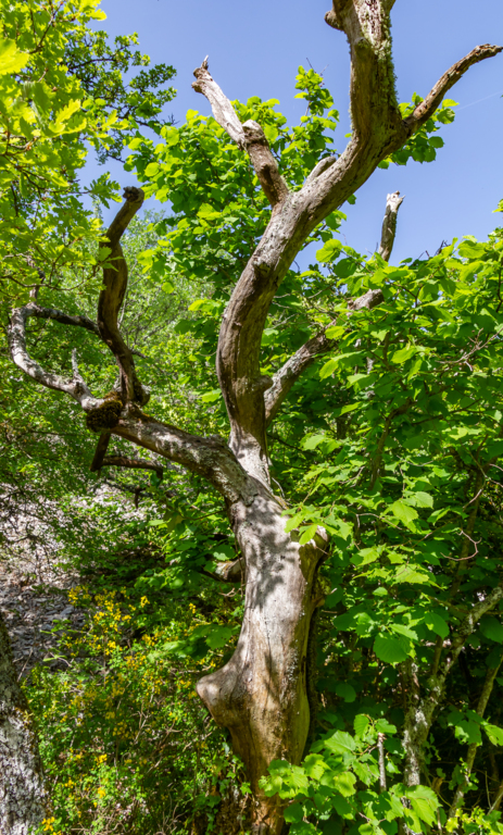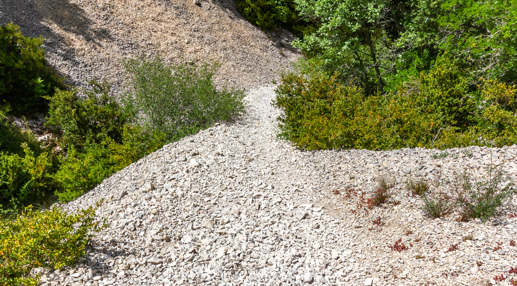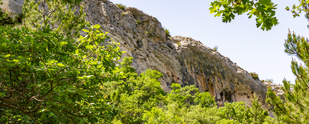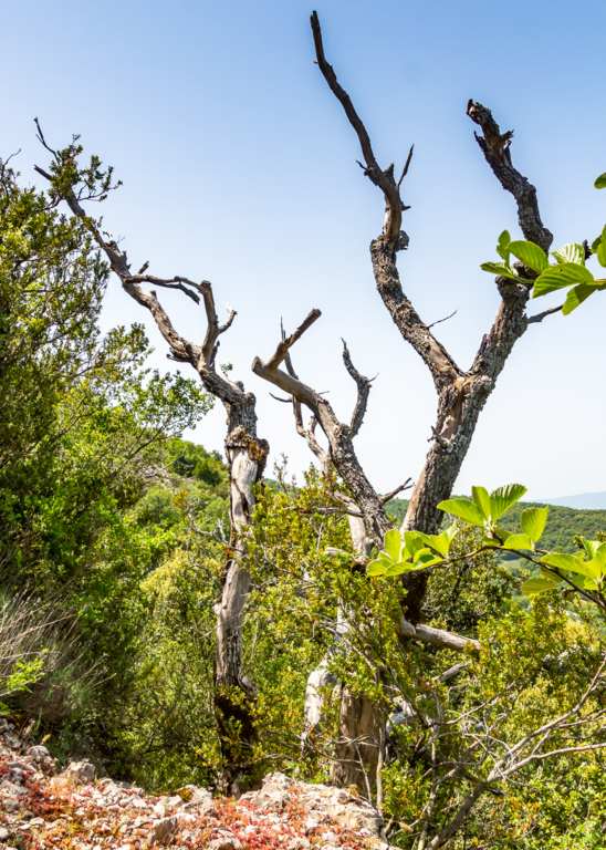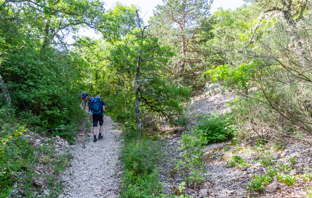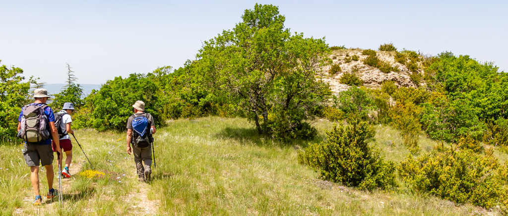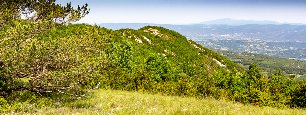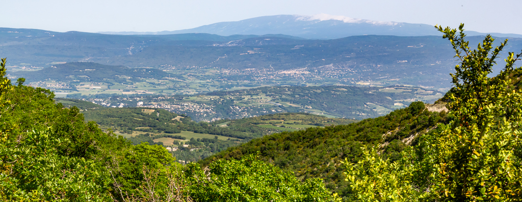 Longue montée le long des Baumes et de la Femme Morte jusqu’à l’Amourralhadou (953 m) avec une belle vue sur le " géant de Provence " : le Mont Ventoux et son sommet pelé.