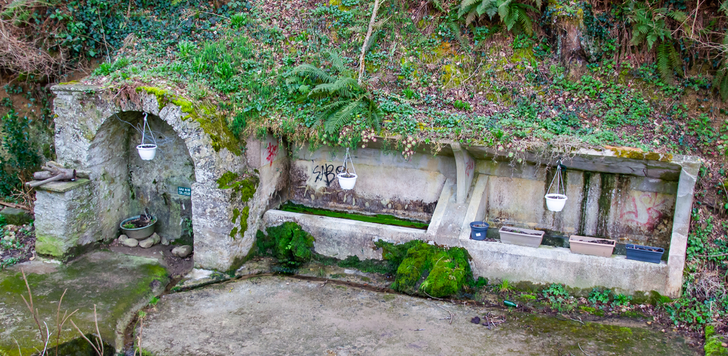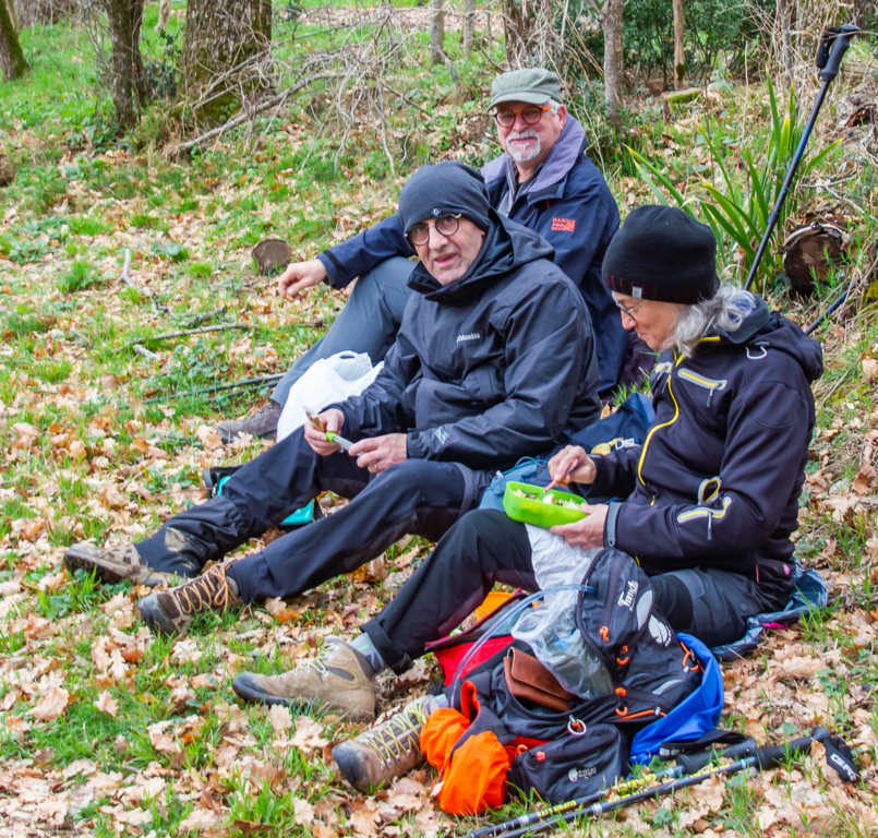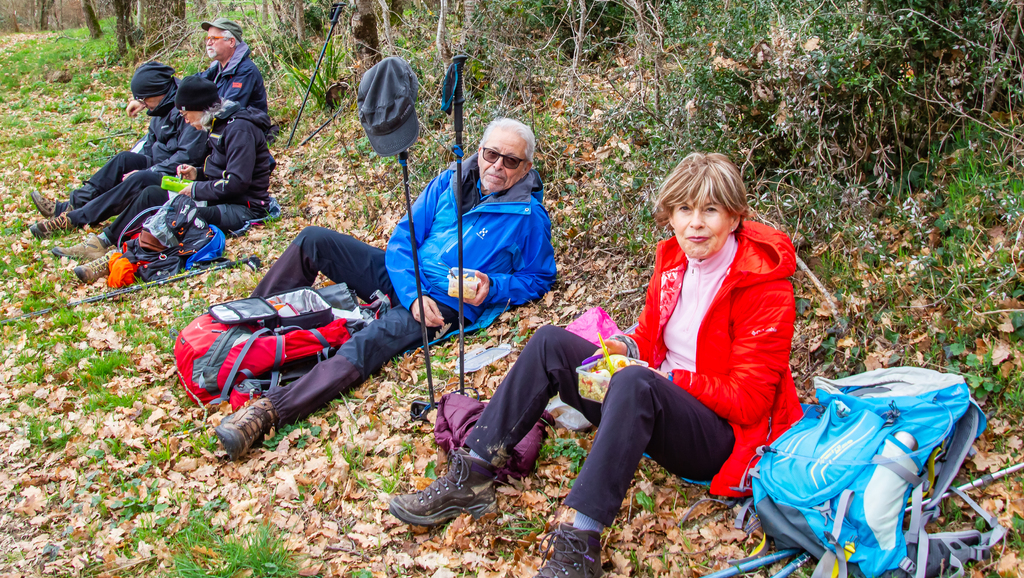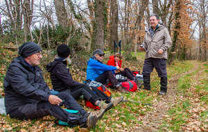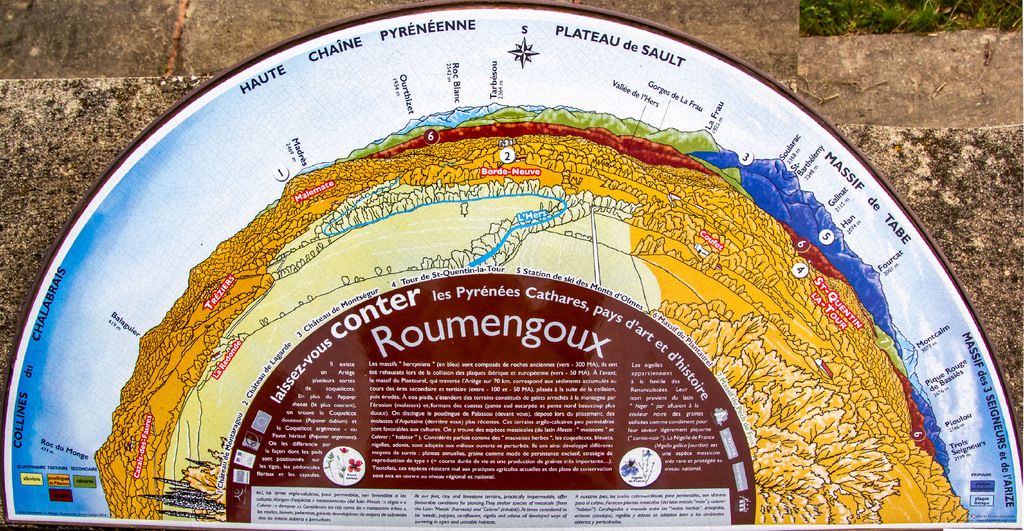 Pause repas sur le GR 7 après Borde Neuve : Belle vue panoramique sur la vallée de l'Hers et sur le village de Roumengoux. Traversée à gué d'un petit affluent de l'Hers très proche. Montée sur chemin particulièrement boueux et collant défoncé par de gros pneus vers Coume Sourde et la fontaine de Bourrastel. Poursuite sur chemin et route plus secs par Pesquiès jusqu'à Roumengoux. Beau point de vue à la table d'orientation de Roumengoux au centre du village.