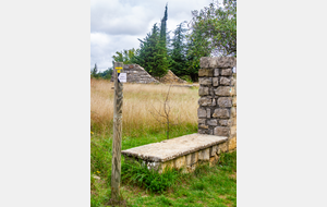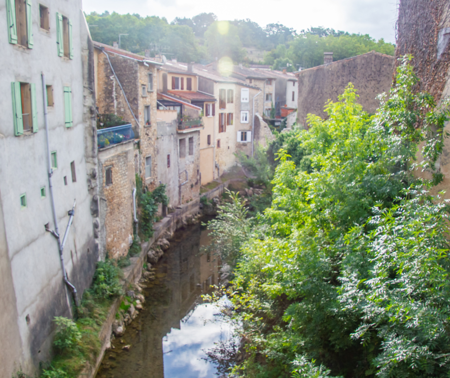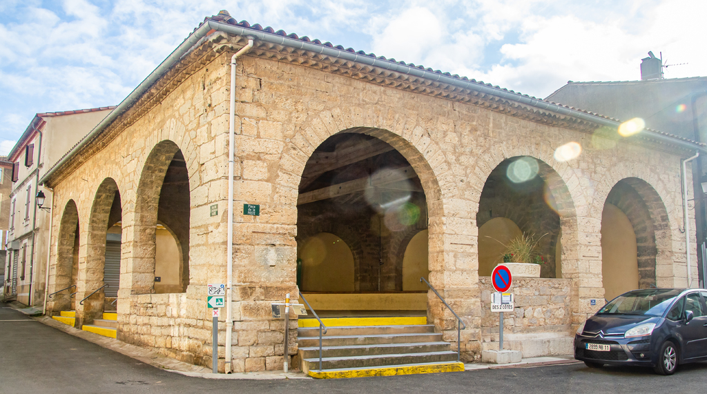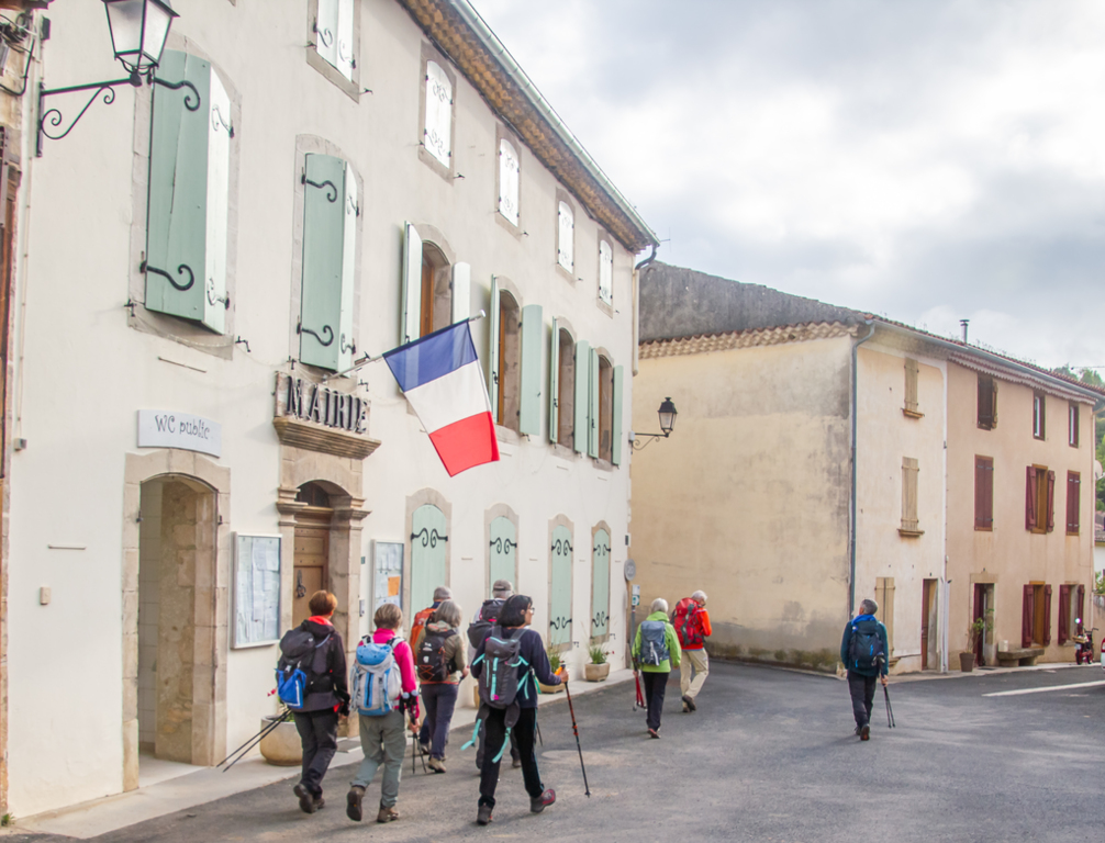 Départ du petit parking de l'église et la mairie de Puivert, rue de l'ancienne mairie avec passage du pont sur le Blau, puis devant la halle avant de prendre la rue du Barry du Lion pour sortir de Puivert en passant sur le ruisseau de Moulières.