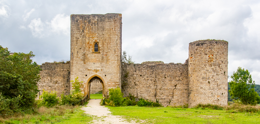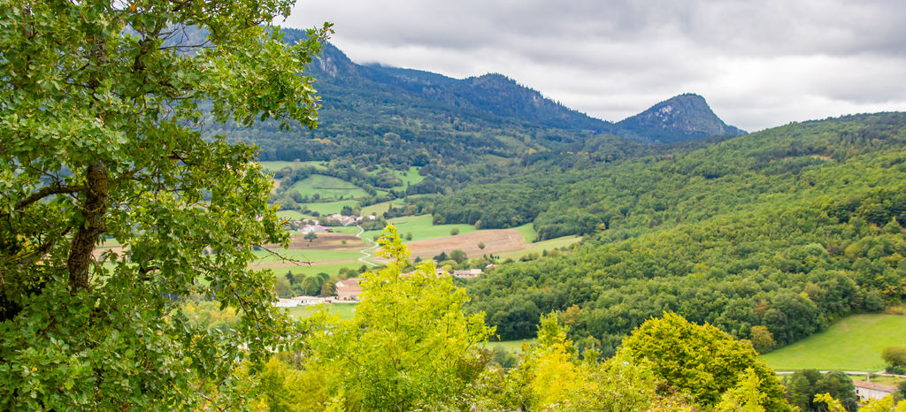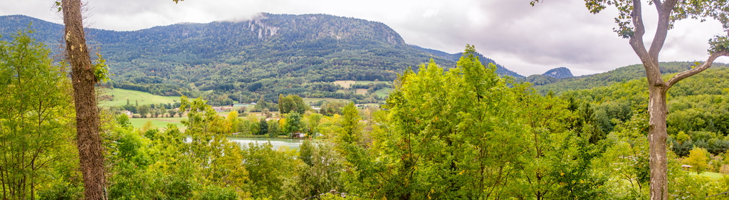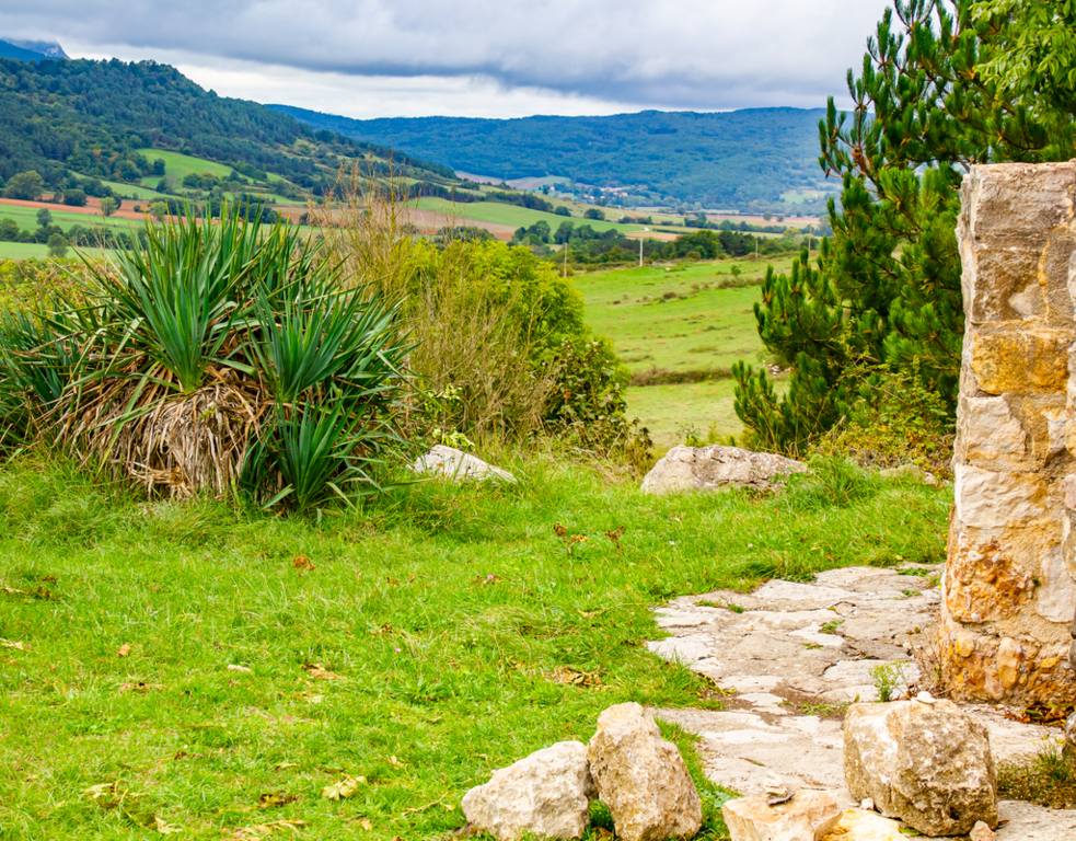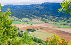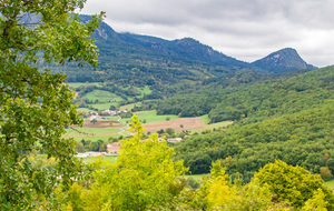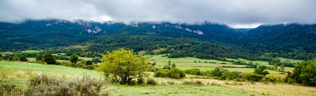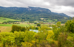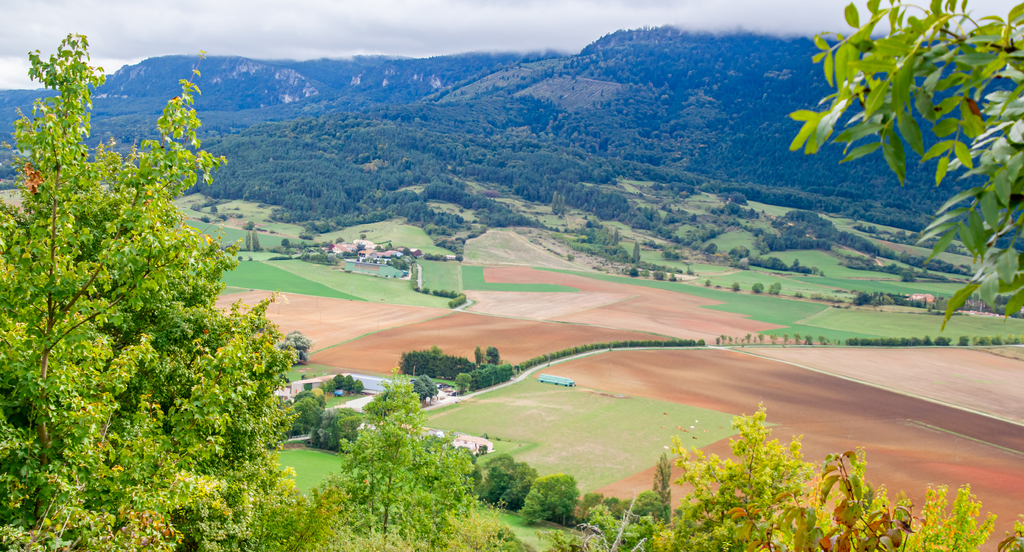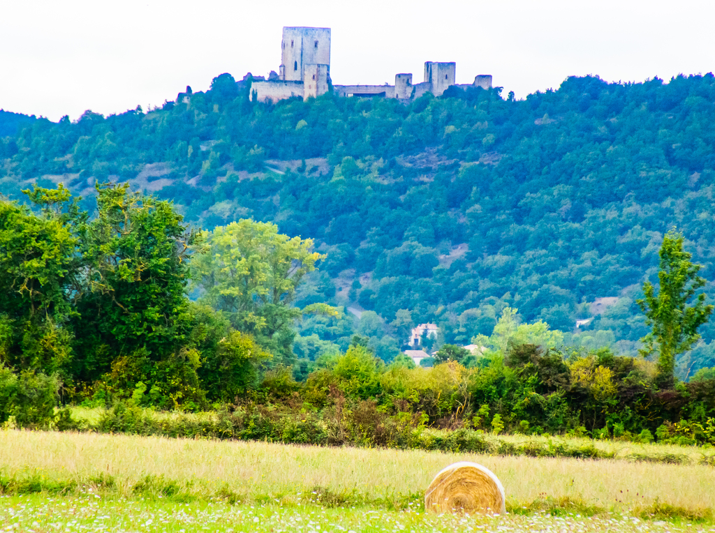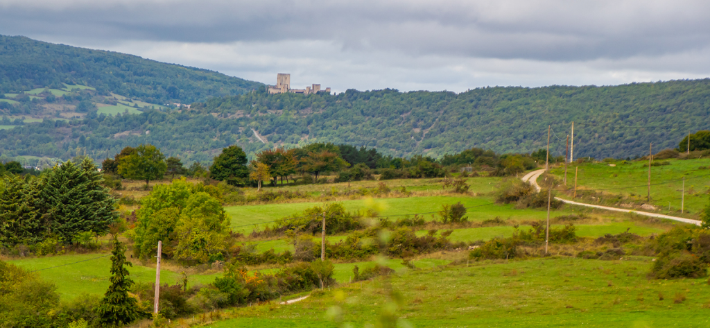 La plaine est entourée à droite et à gauche de massifs calcaires recouverts de belles forêts avec une vue en contre plongée sur le château Cathare de Puivert.