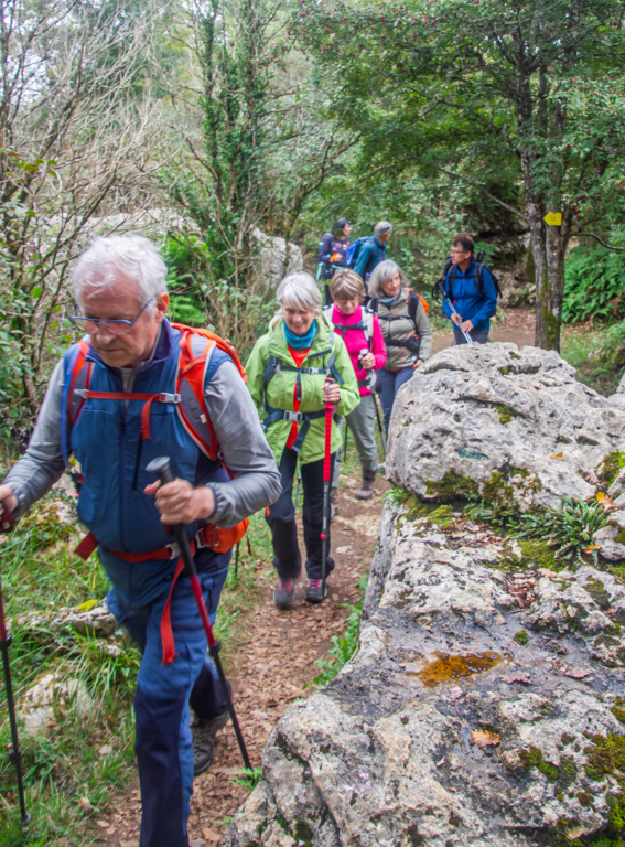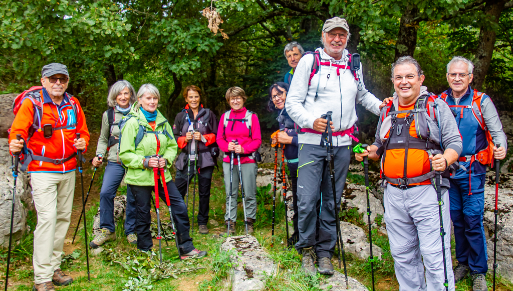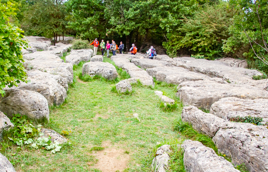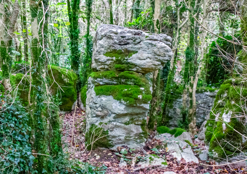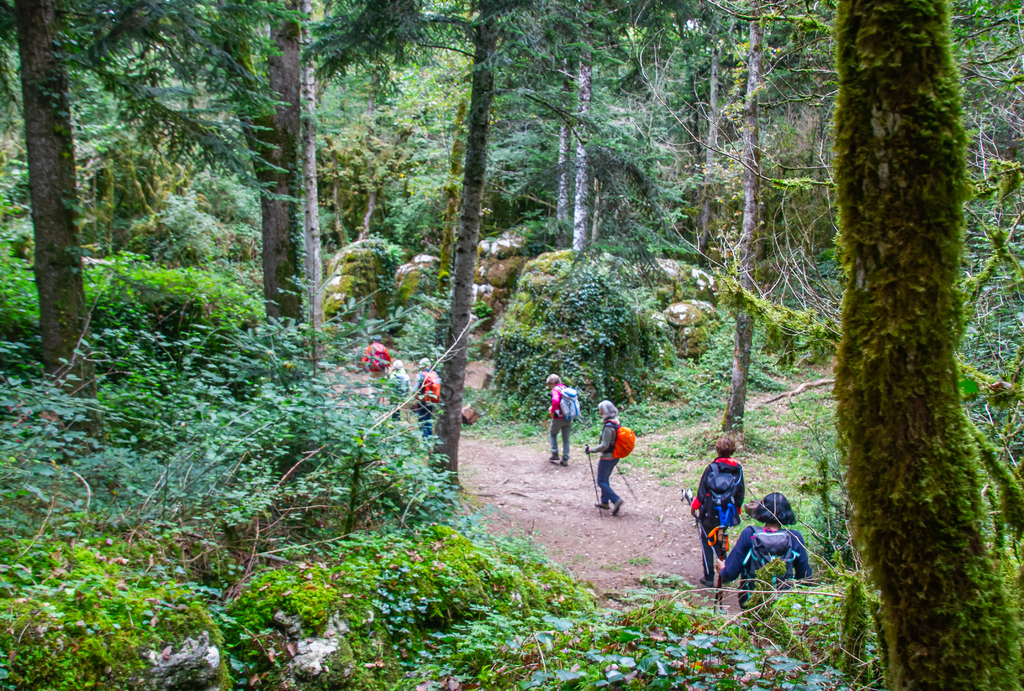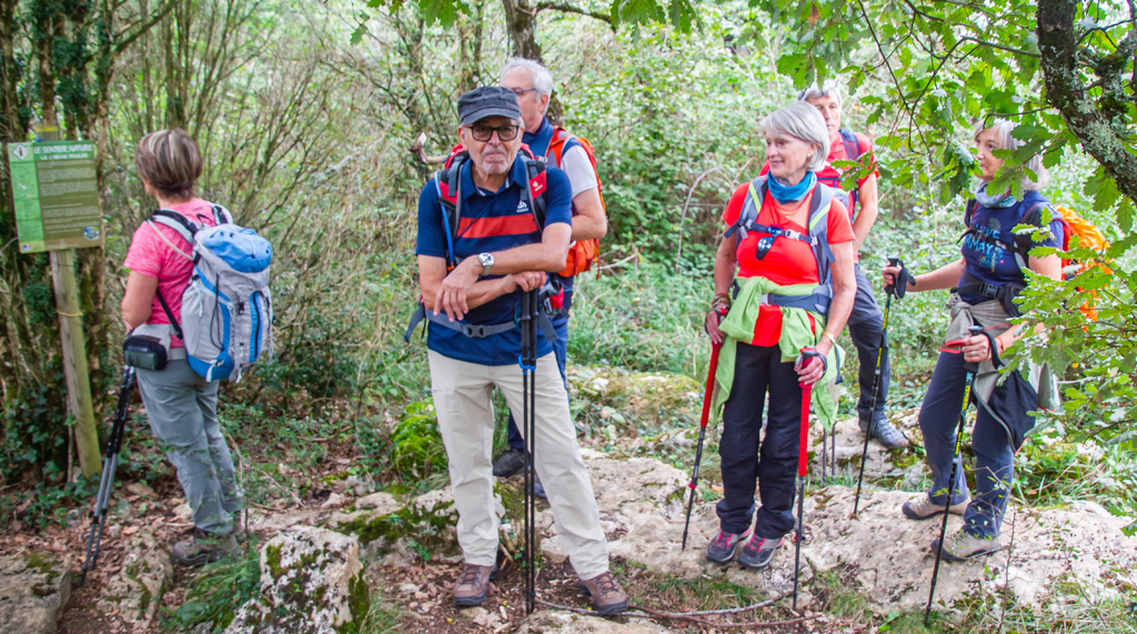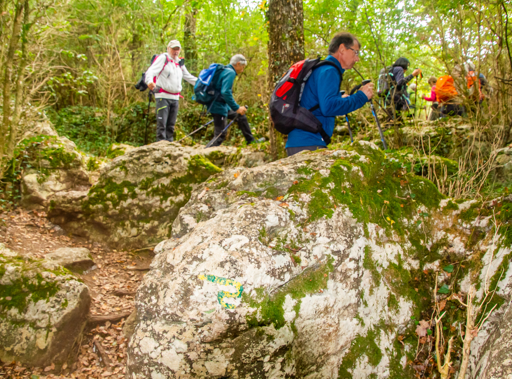 Le Sentier Nature débute au niveau des ruines restaurées de moulin à vent (alt:610m) pour ensuite s'enfoncer dans le dédale d'un Lapiaz calcaire avec une première rencontre avec un Chêne Poulpe. Entrée dans le Labyrinthe Vert avec une pause repas avant d'atteindre le Grand Lapiaz puis Le Clot de l'Encatado, le Sapin Harpe, le Ch^ne Vieux et les ruines d'En Dominique.