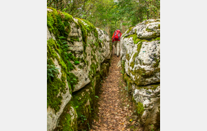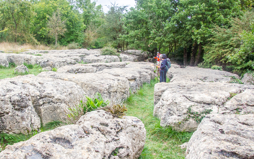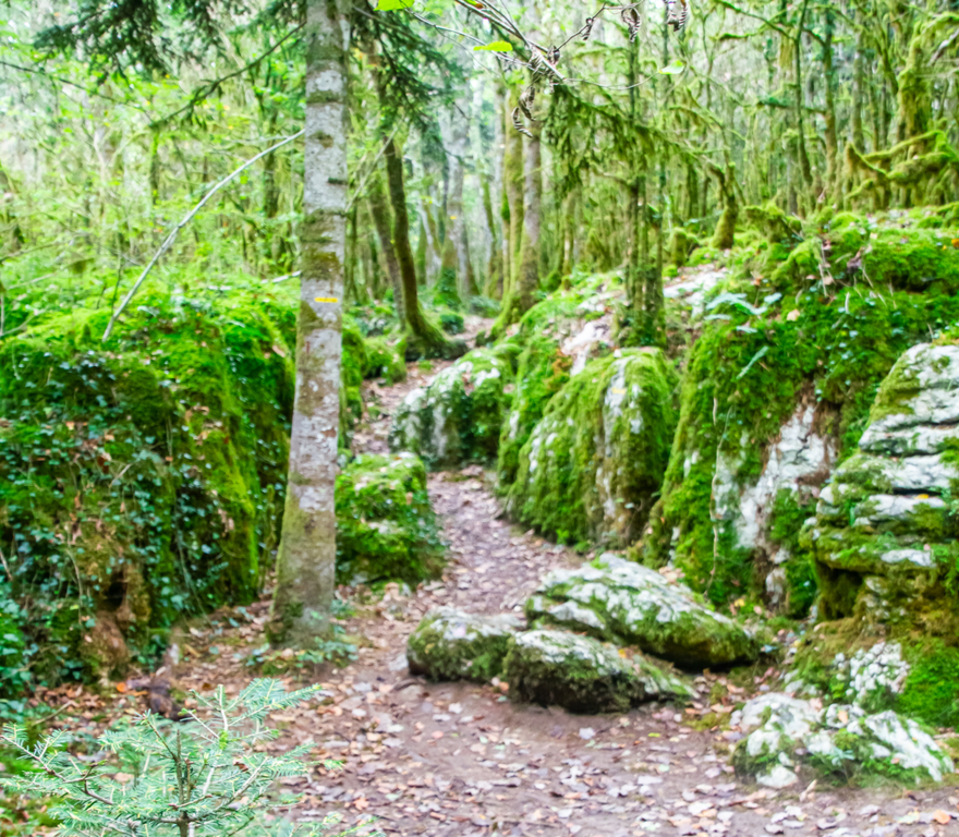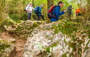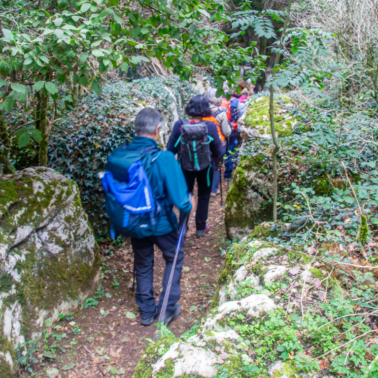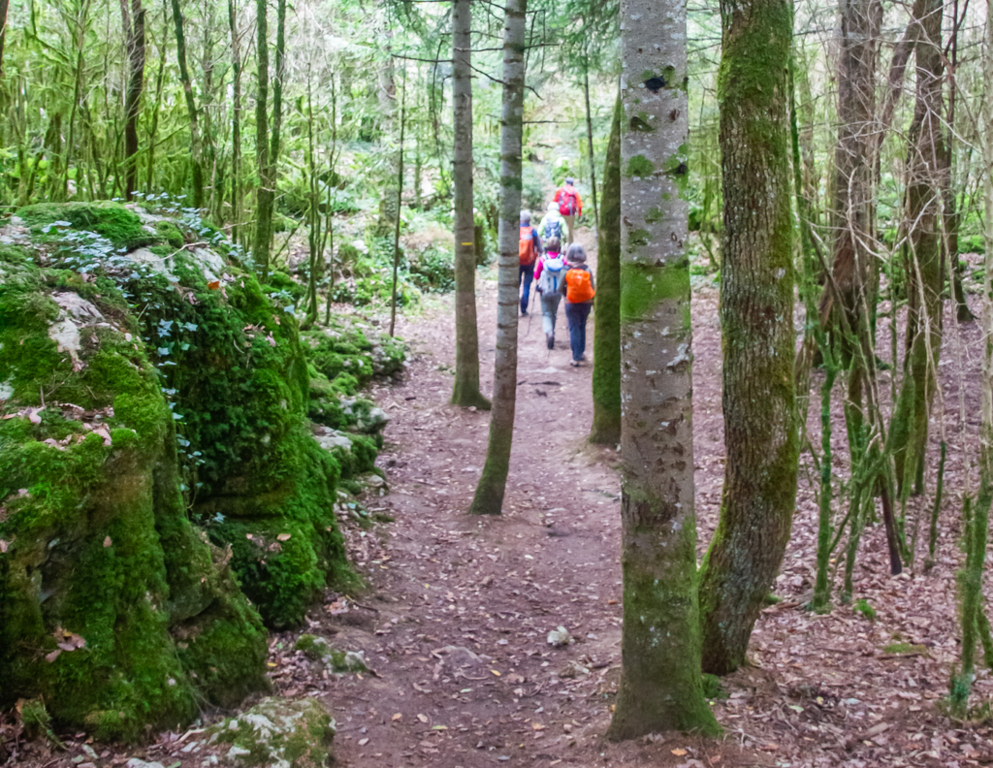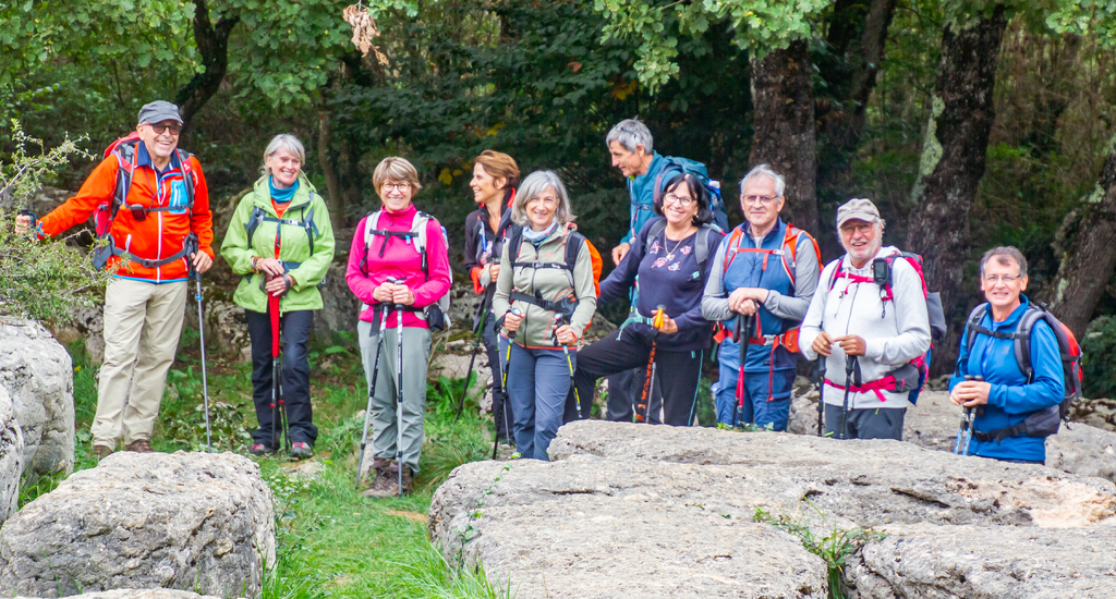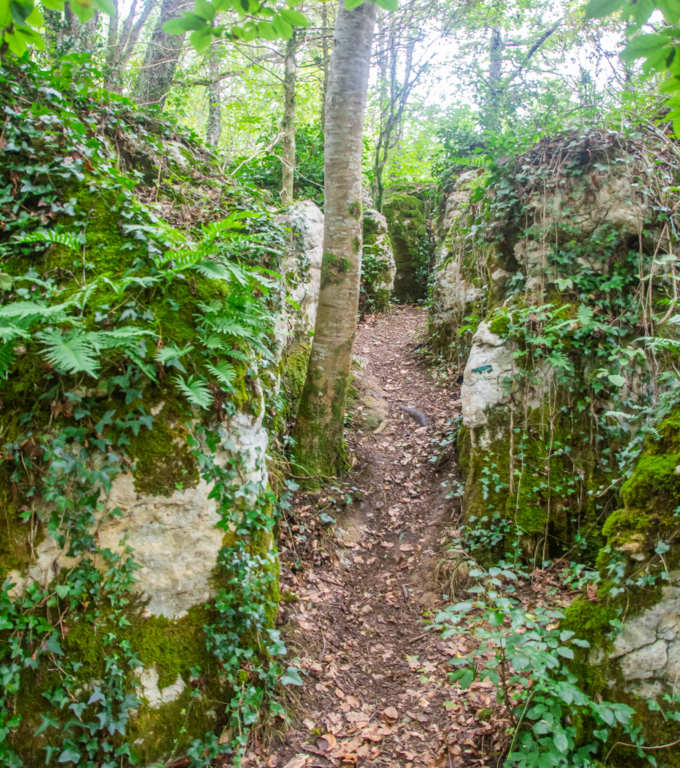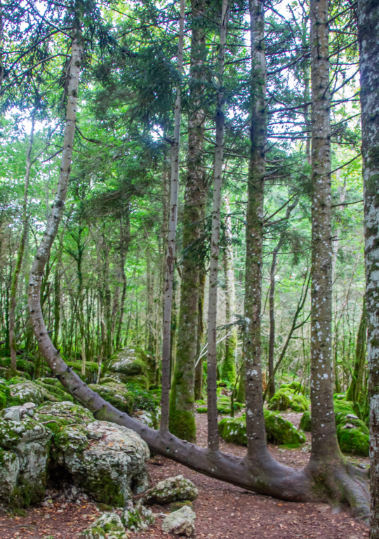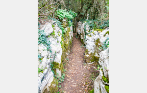 Le Sentier Nature débute au niveau des ruines restaurées de moulin à vent (alt:610m) pour ensuite s'enfoncer dans le dédale d'un Lapiaz calcaire avec une première rencontre avec un Chêne Poulpe. Entrée dans le Labyrinthe Vert avec une pause repas avant d'atteindre le Grand Lapiaz puis Le Clot de l'Encatado, le Sapin Harpe, le Ch^ne Vieux et les ruines d'En Dominique.