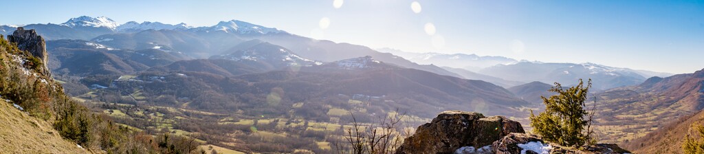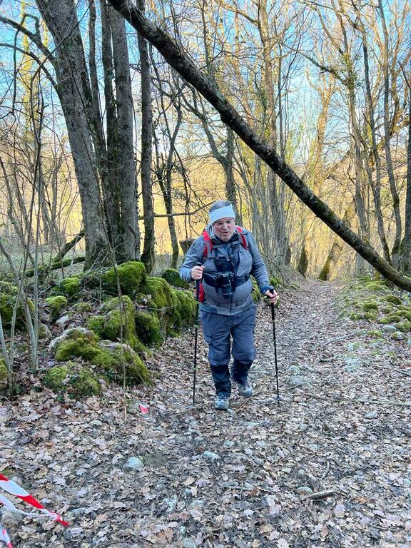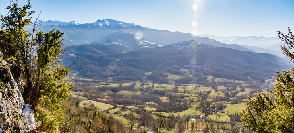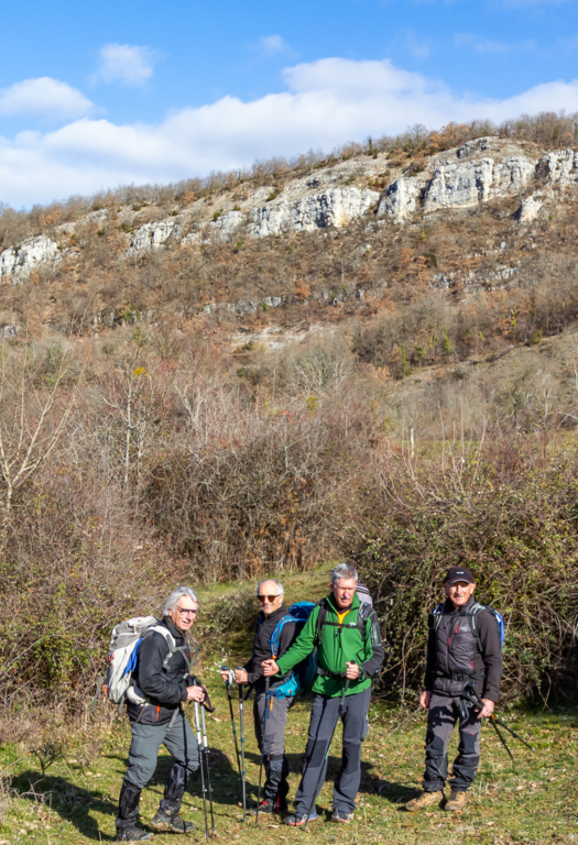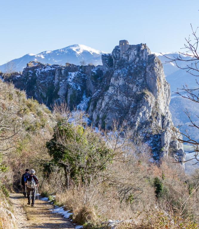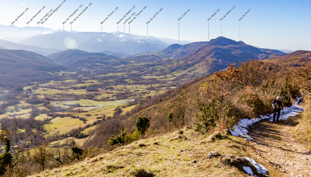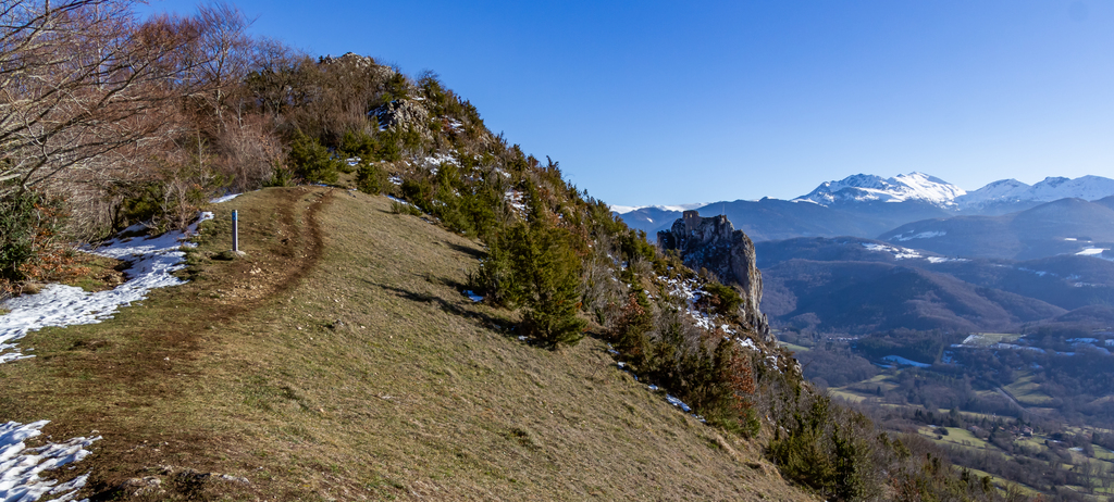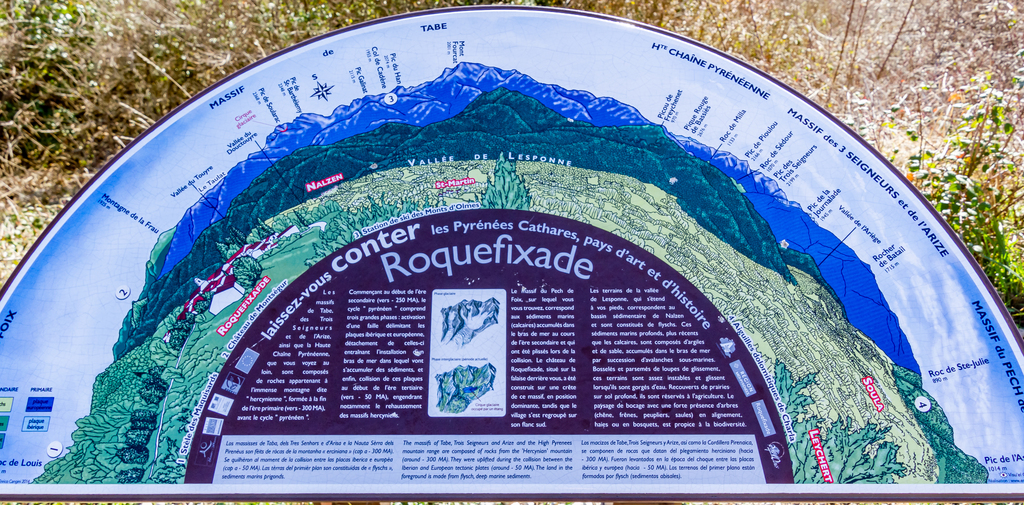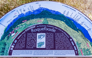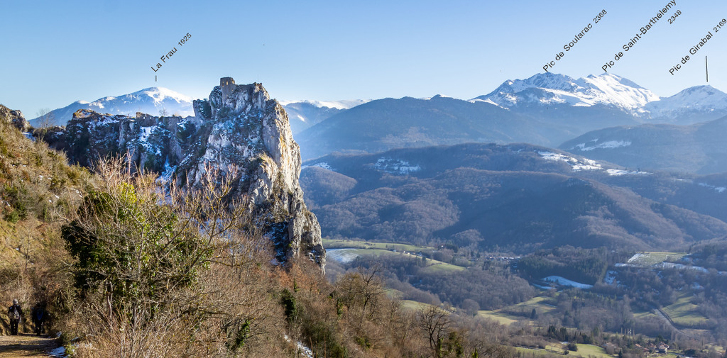 Longue remontée particulièrement pentue à la sortie de Roquefort puis en passant par Rasigot, Palette, Bac d'en haut, les Moulinières, au pied du Cap du Rouquet (916m) pour rejoindre le GR de Pays d'Olmes et arrivé au pied des ruines du château de Roquefixade avec un panorama splendide de Montségur jusqu'au pic de l'Aspre avec tous les massifs déjà cités.