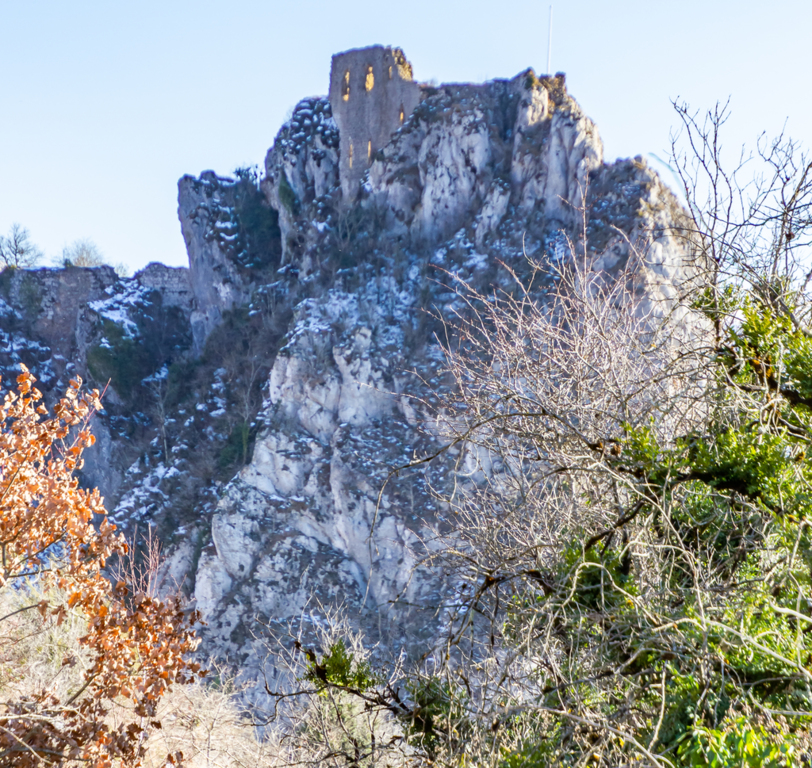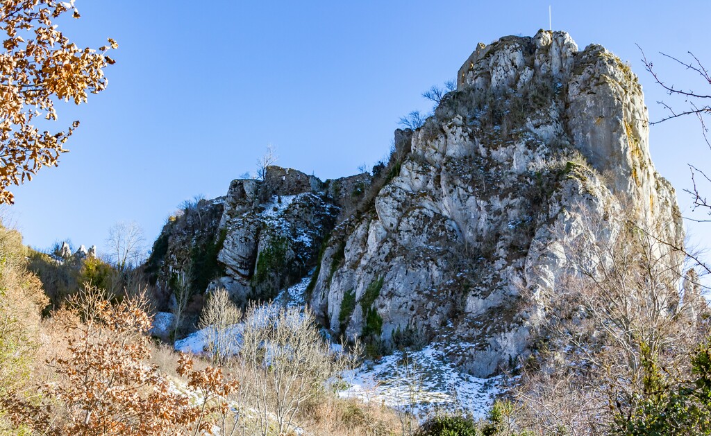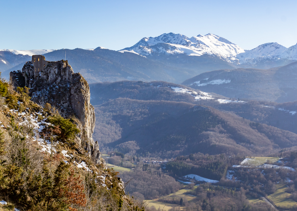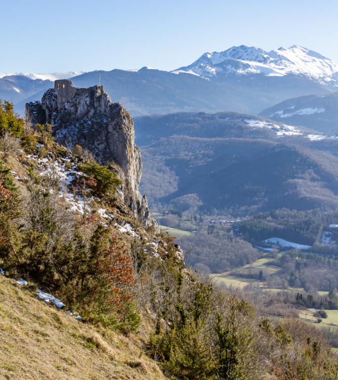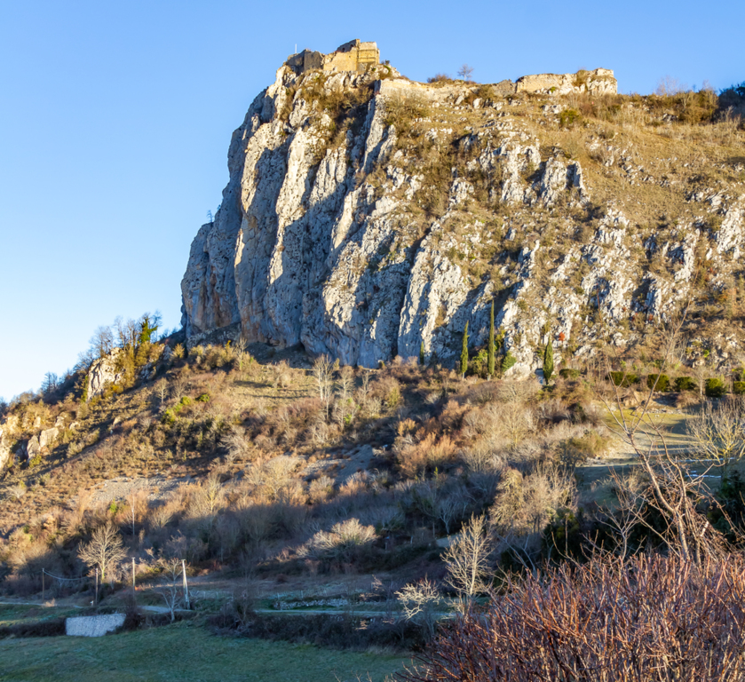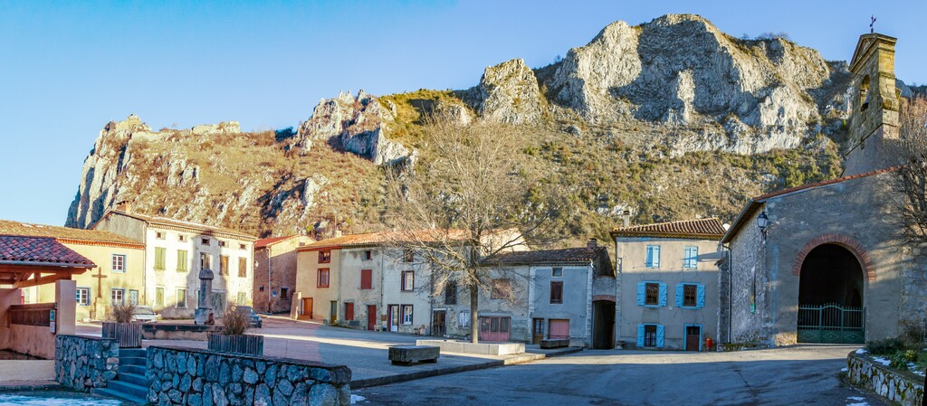 Courte descente sur Roquefixade au pied des Rocs Marot et de la Lauzade supportant le château.