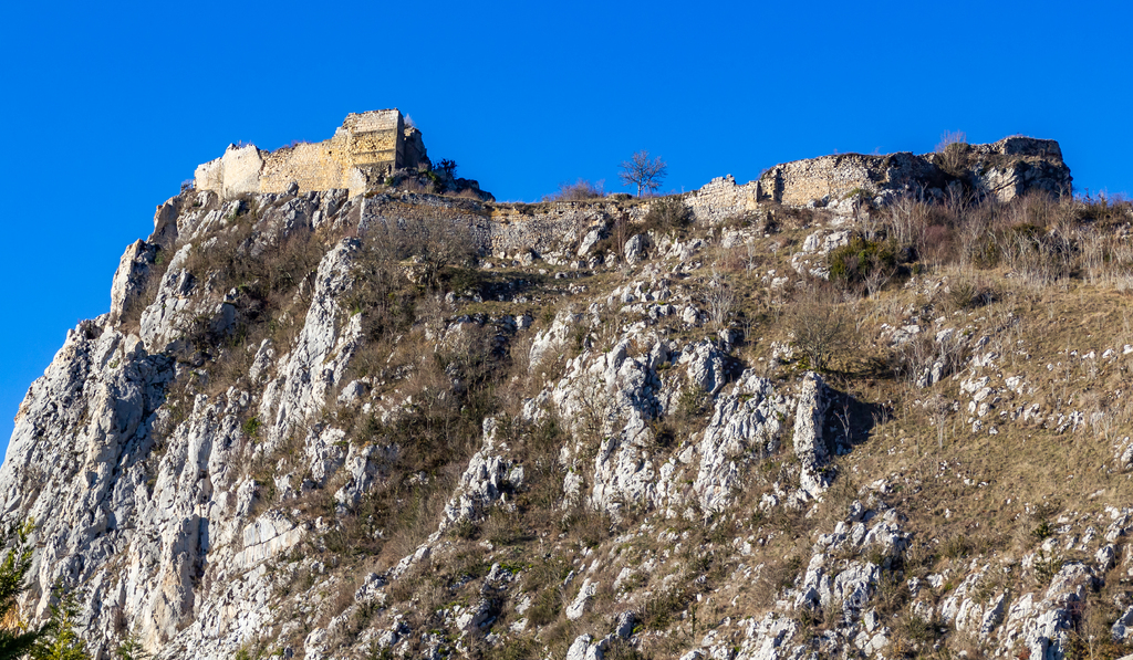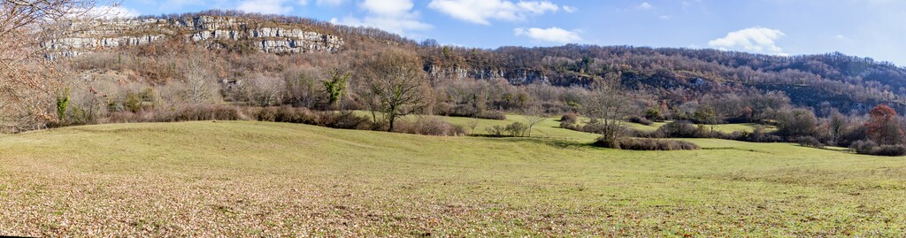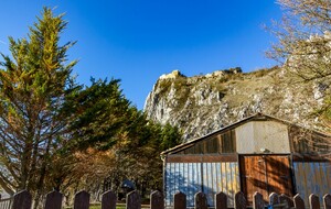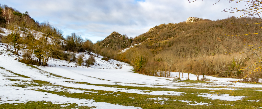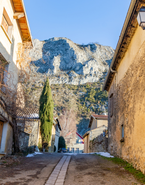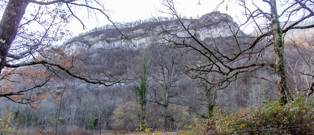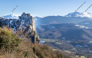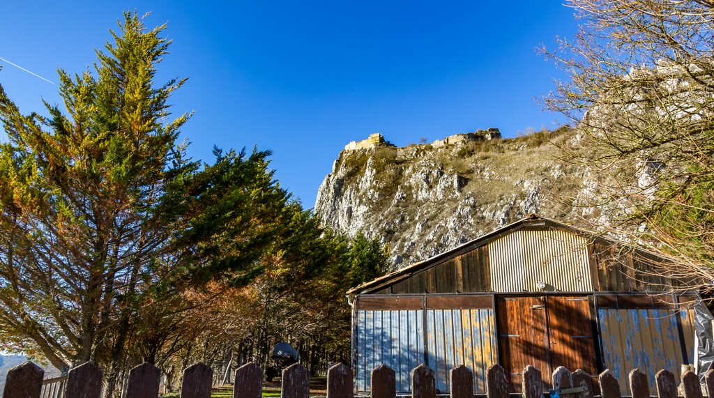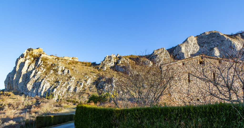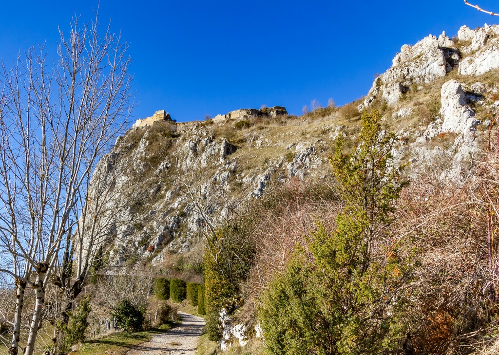Courte descente sur Roquefixade au pied des Rocs Marot et de la Lauzade supportant le château.