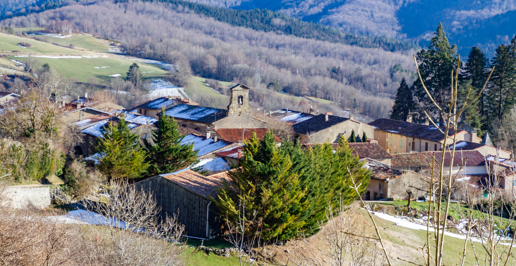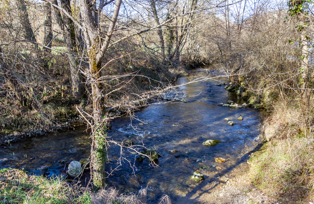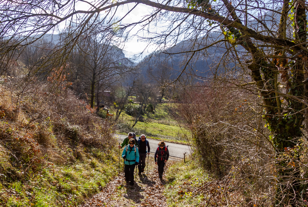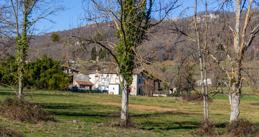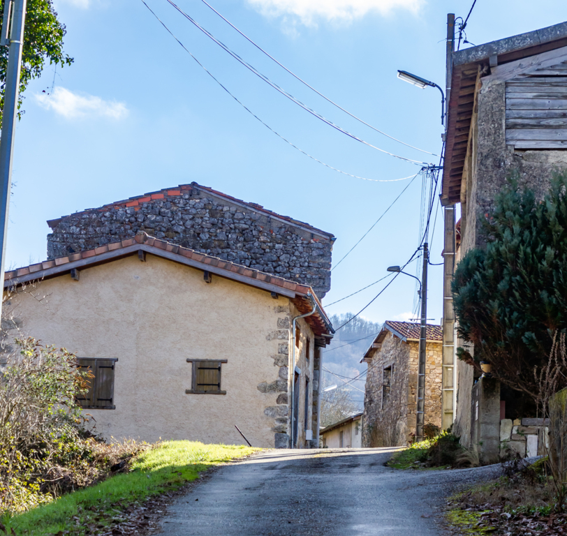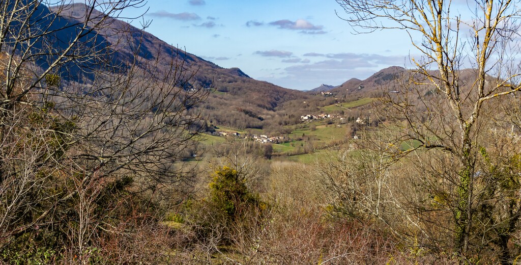 Longue descente à partir du Clot de Grésat, en passant par Le Grésat, Bac d'en bas, le Pont de la Pichole sur le Douctouyre jusqu'au hameau de Tanière. Cheminement de la Croix du Rouyre jusqu'au village de Roquefort les Cascades en passant par Nizard, Cazal, le village d'Ilhat, le Planel, Ponceau d'Anguille.