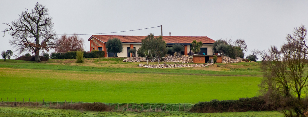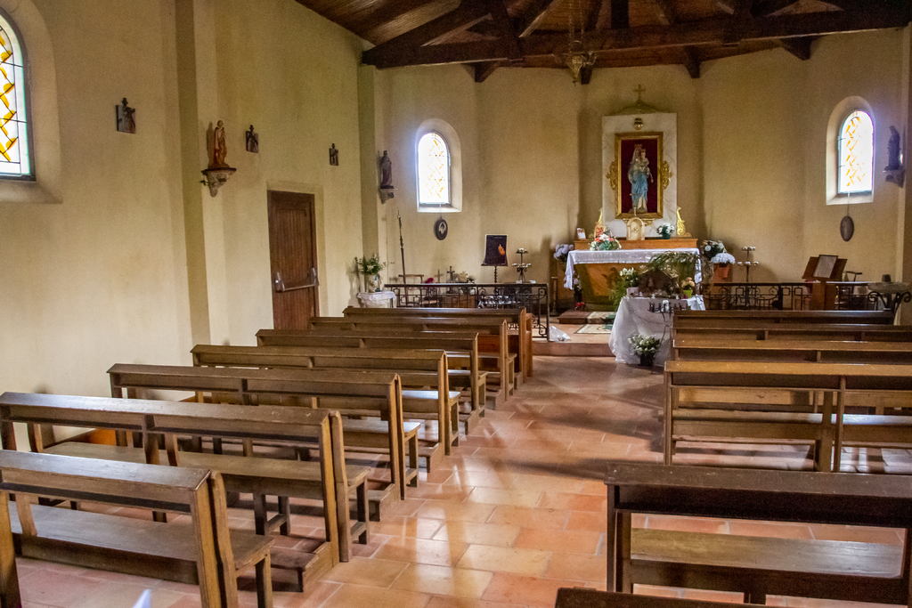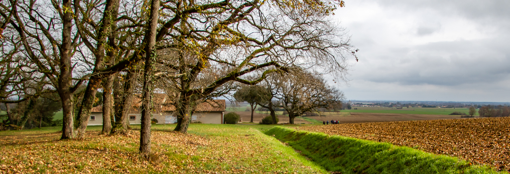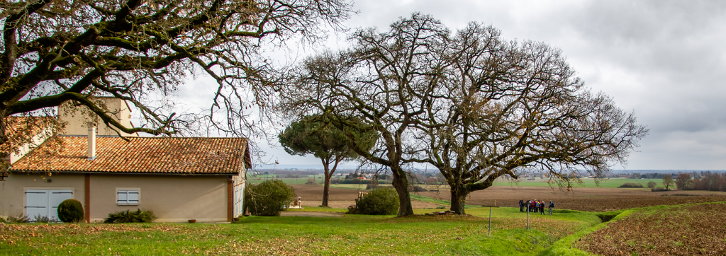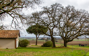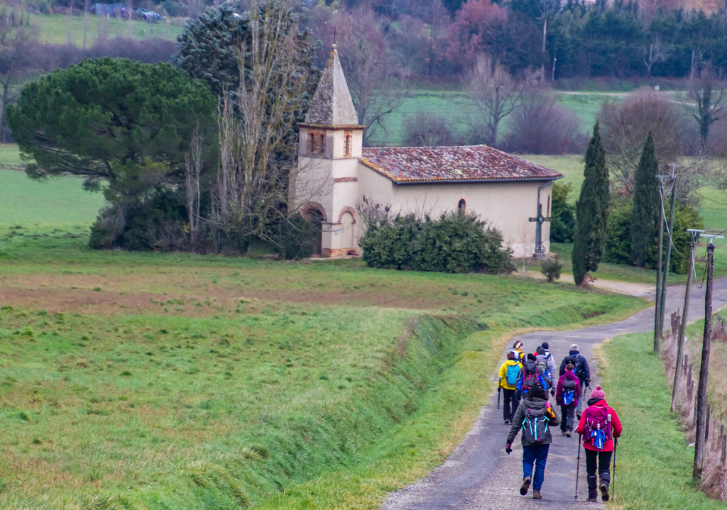 Belle vue sur Moussayre, l'étang de Paillassayre et absence de vue sur les Pyrénées. Poursuite sur la route de Naples puis descente du chemin de la chapelle vers la Chapelle Notre Dame des Aubets, retraversée du ruisseau de La Goutoule, passage aux abords du parc d'attraction Animaparc avec les pigeonniers du Pouchot.