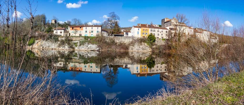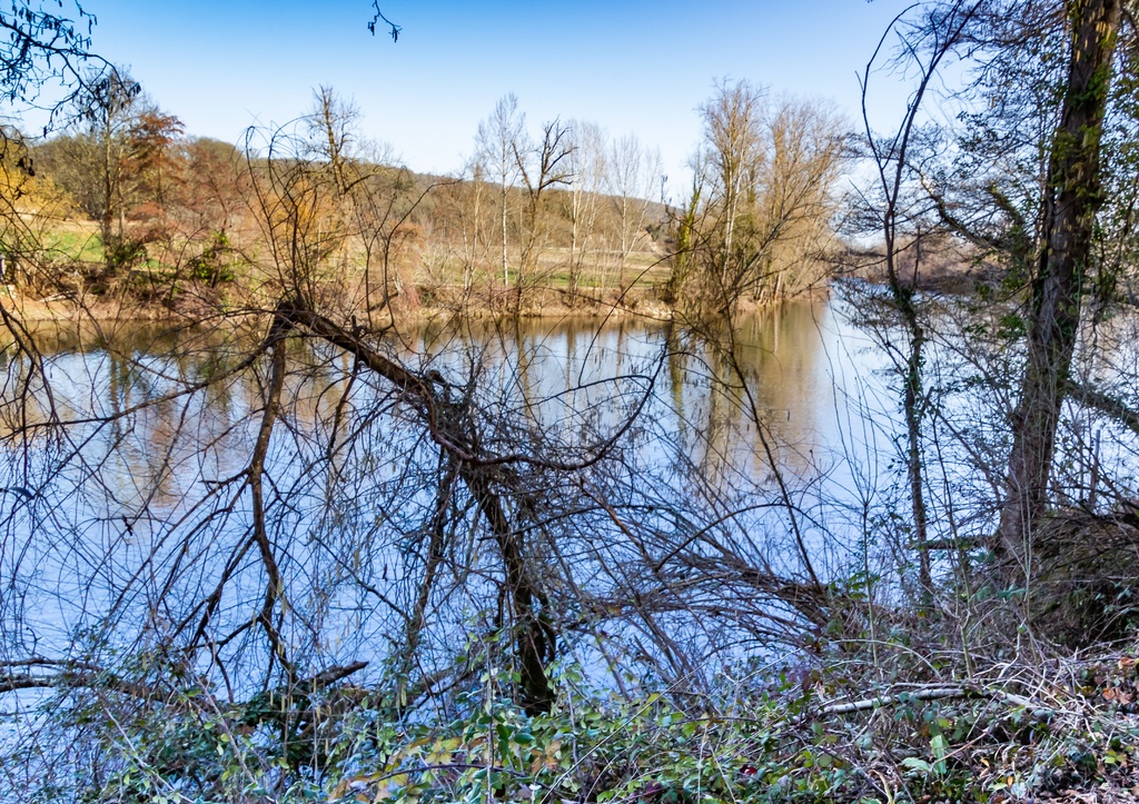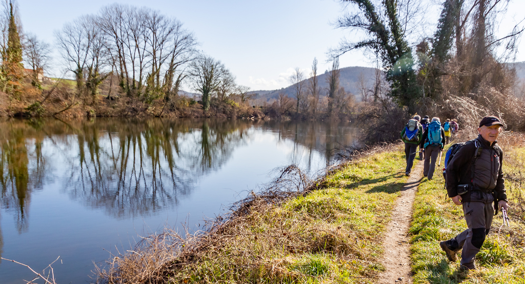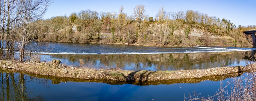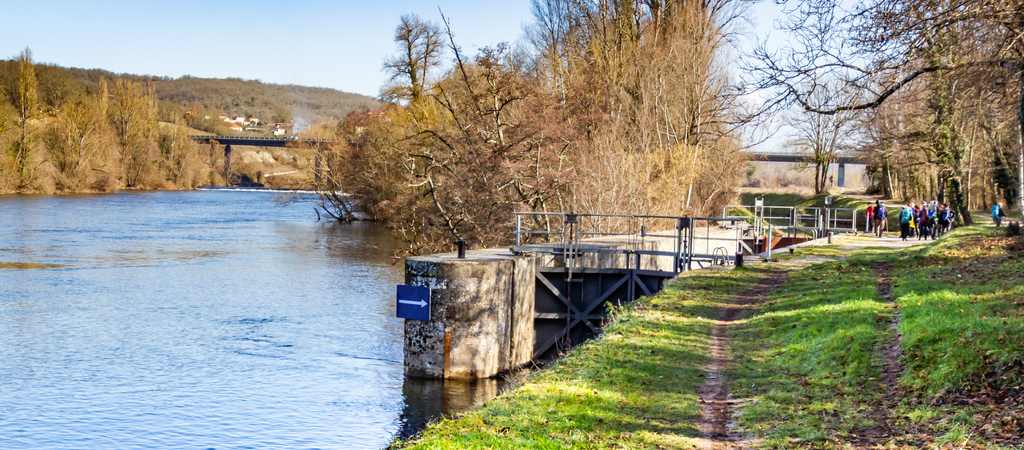 Cheminement le long du Lot par le GR36 en passant à coté de l'écluse d'Arcambal puis en poursuivant sur la rive pour une pause repas au pied du village de Savanac après être passé sous le viaduc de l'A20.