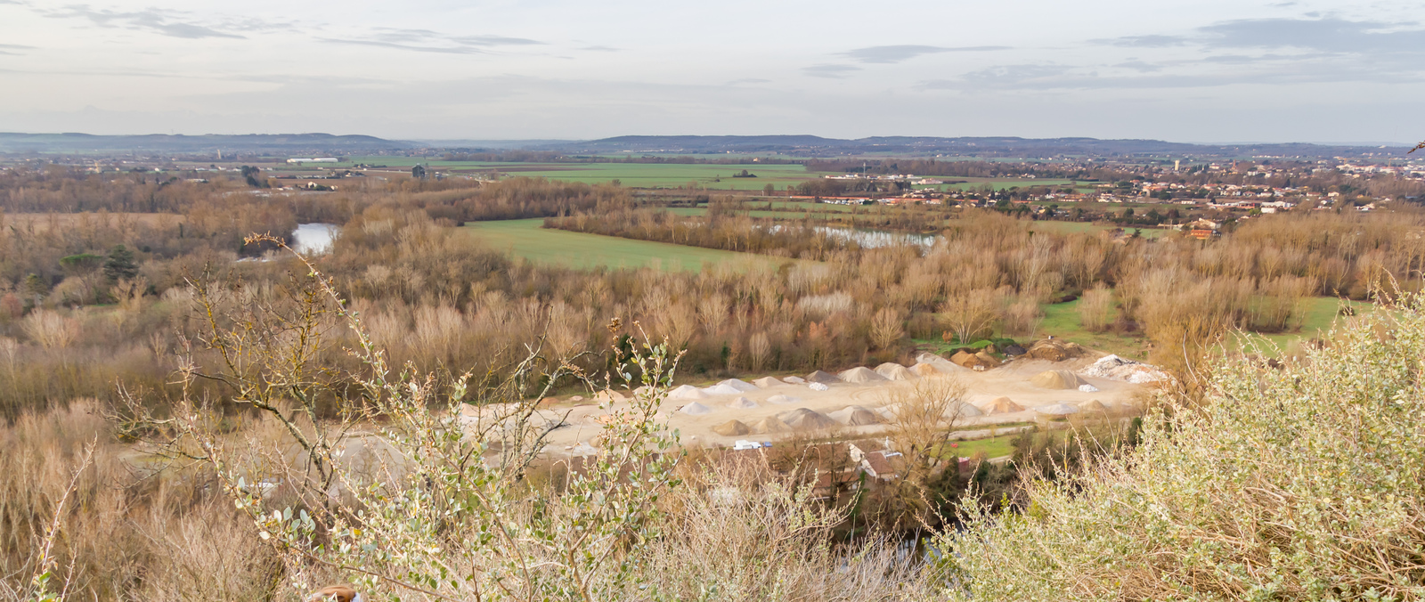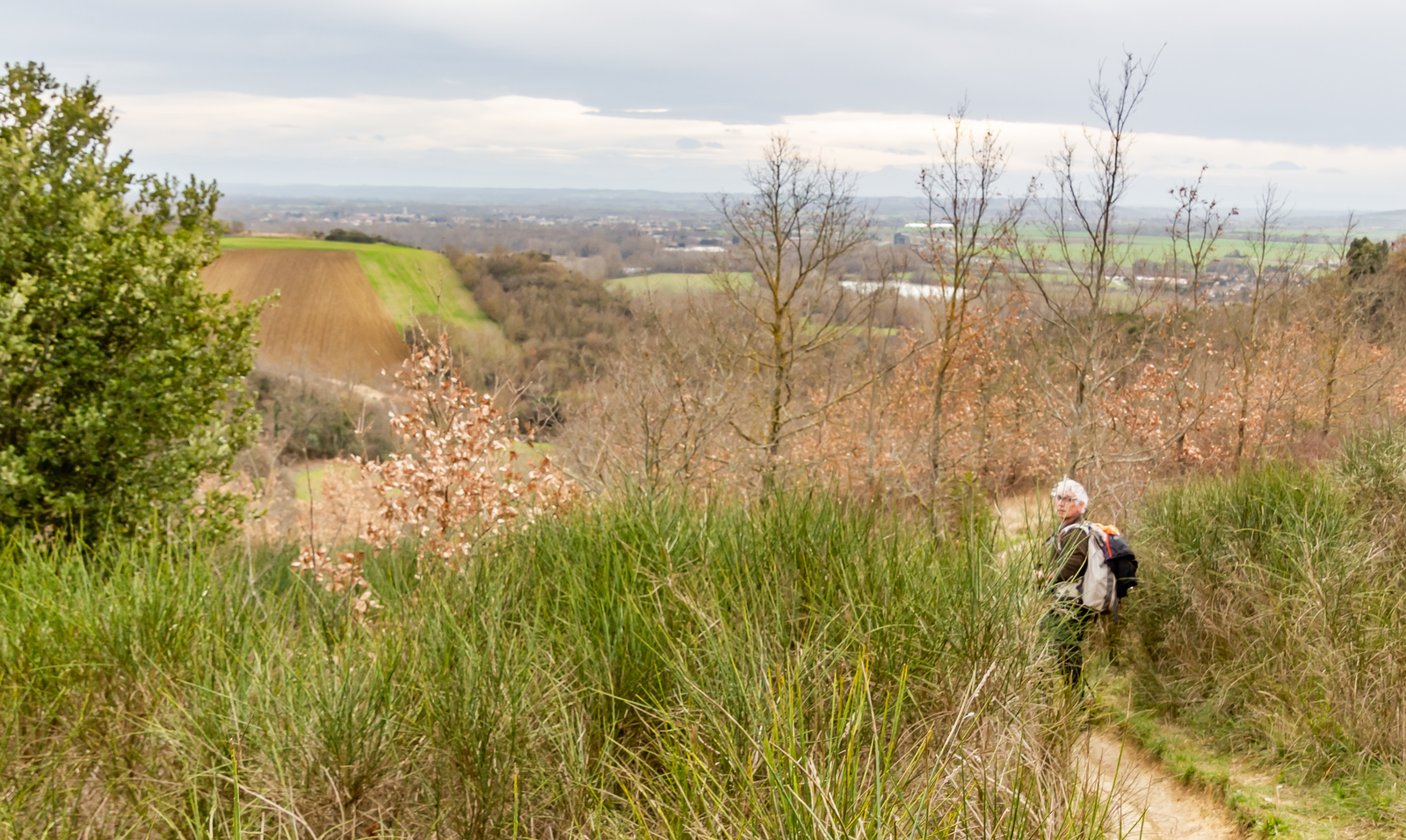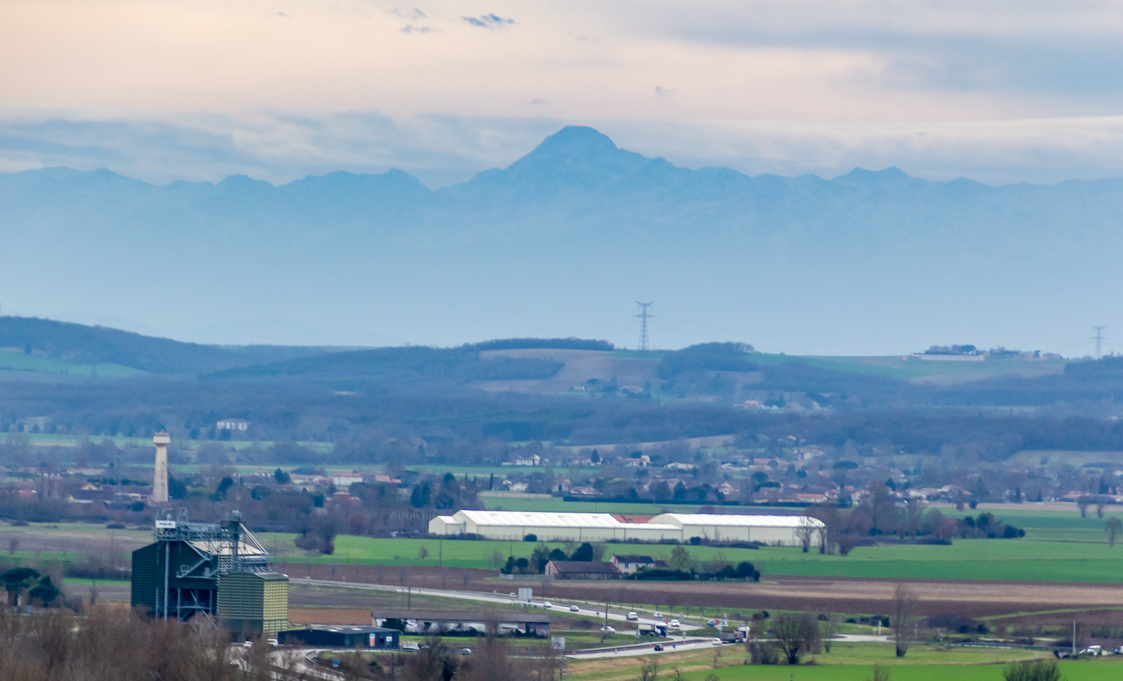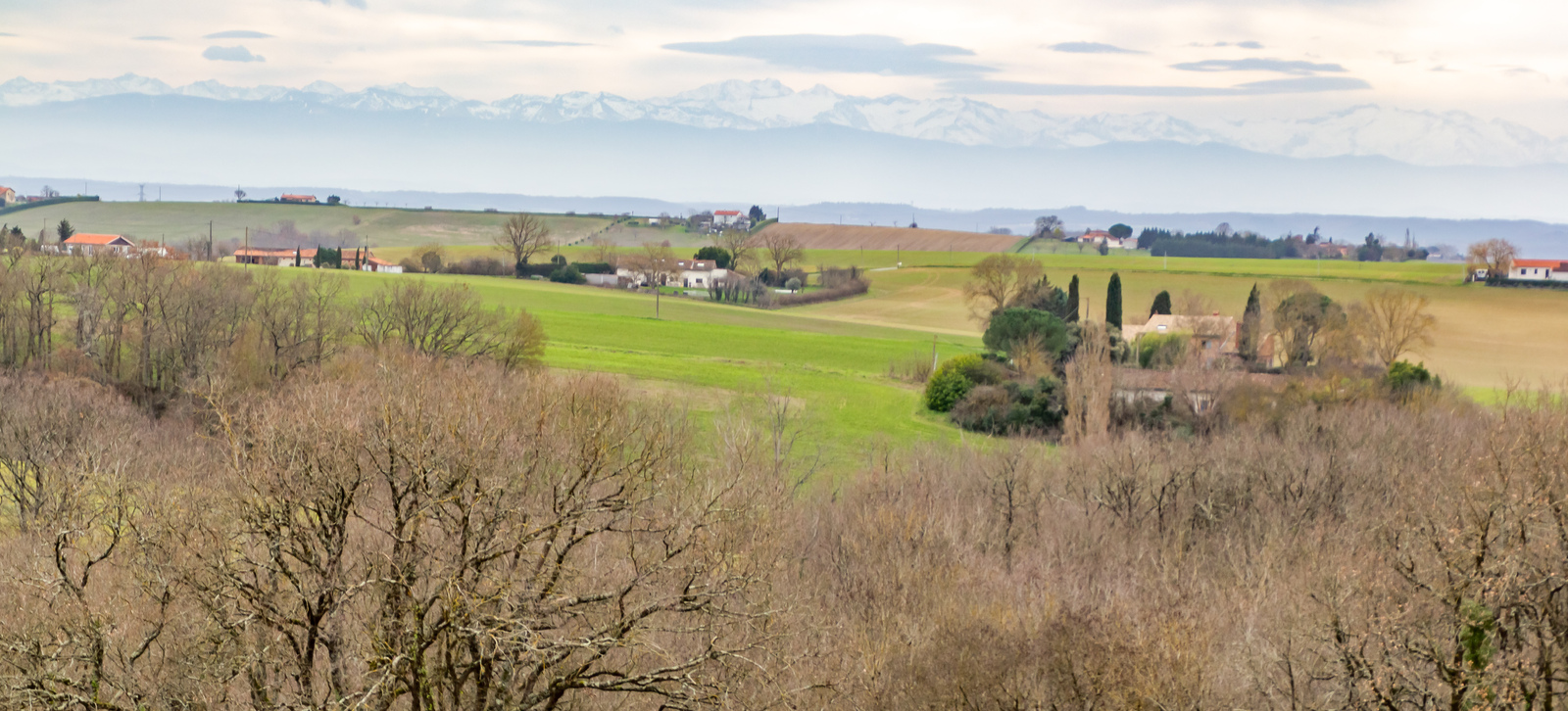Poursuite sur le chemin de la Pouzaque, chemin de Marcounat pour rejoindre le Tumulus avec vue très étendue sur les vallées de l'Ariège, la Lèze, la Garonne au loin et les Pyrénées à peine visibles. Descente abrupte vers le chemin de la Pouzaque, petite remontée sur ce chemin pour redescendre sur le parking de Clermont le Fort.