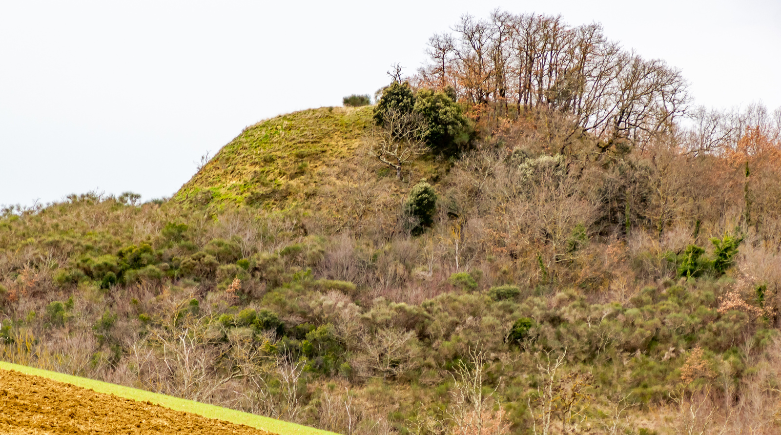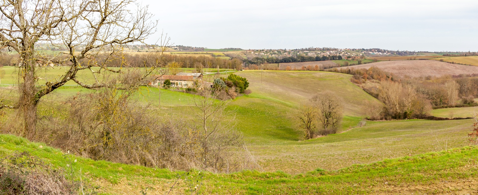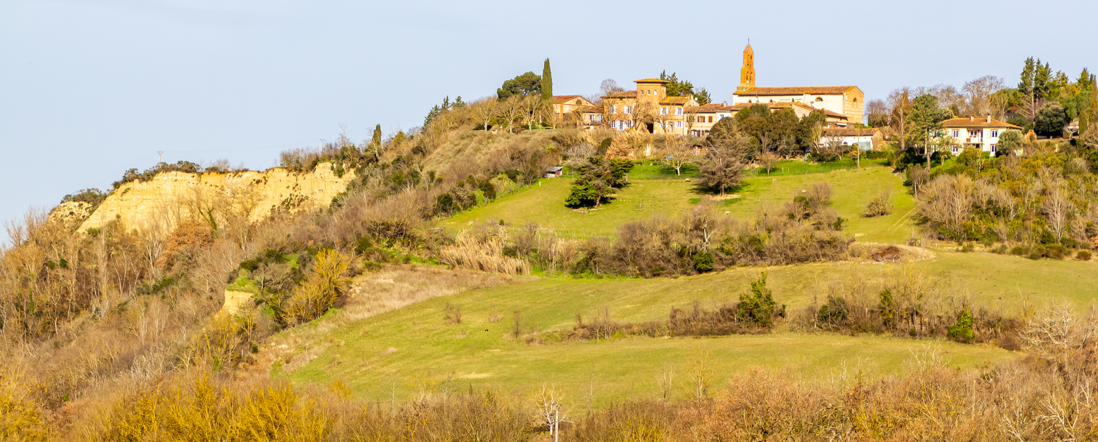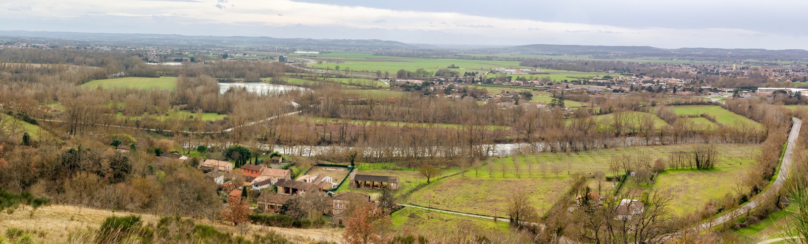 Poursuite sur le chemin de la Pouzaque, chemin de Marcounat pour rejoindre le Tumulus avec vue très étendue sur les vallées de l'Ariège, la Lèze, la Garonne au loin et les Pyrénées à peine visibles. Descente abrupte vers le chemin de la Pouzaque, petite remontée sur ce chemin pour redescendre sur le parking de Clermont le Fort.