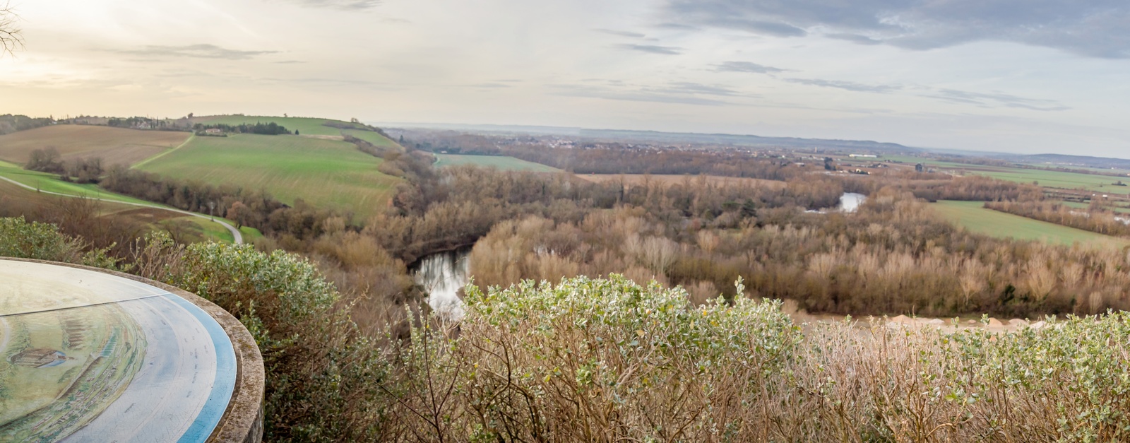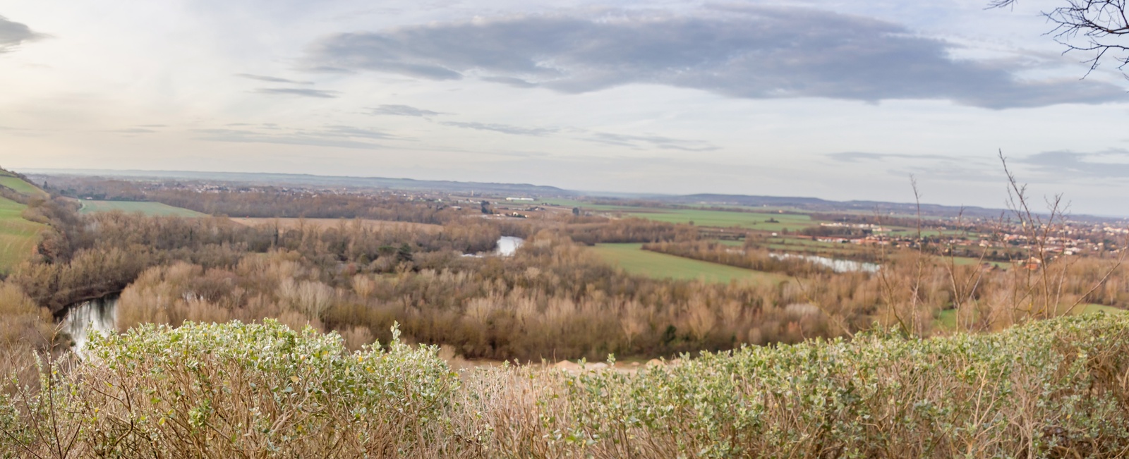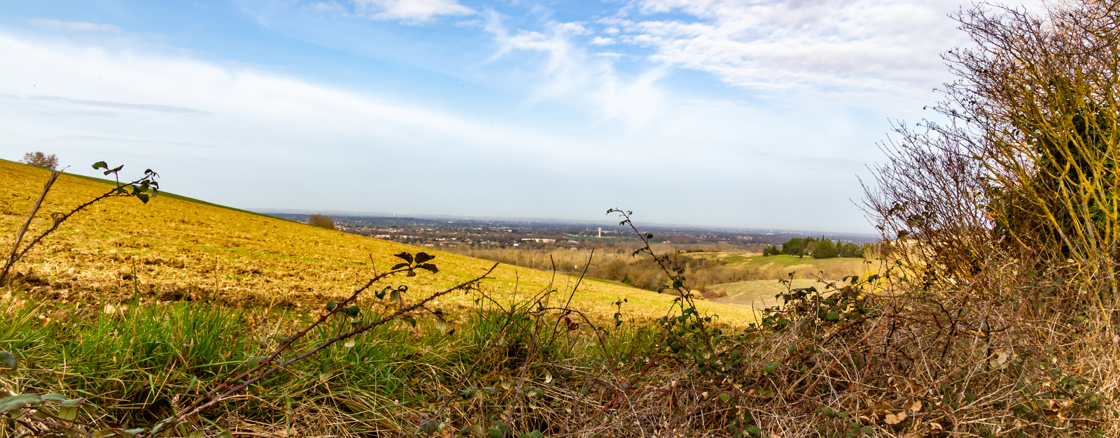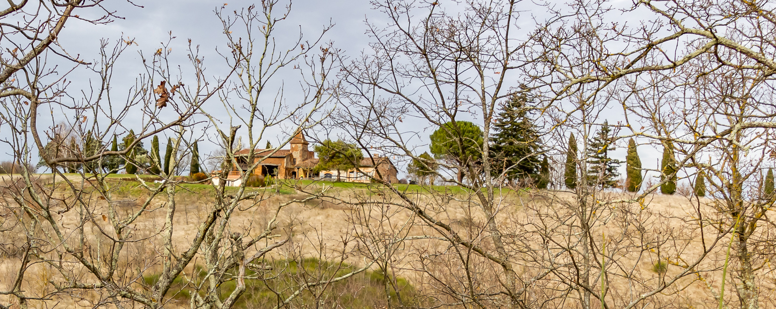 Poursuite sur le chemin de la Pouzaque, chemin de Marcounat pour rejoindre le Tumulus avec vue très étendue sur les vallées de l'Ariège, la Lèze, la Garonne au loin et les Pyrénées à peine visibles. Descente abrupte vers le chemin de la Pouzaque, petite remontée sur ce chemin pour redescendre sur le parking de Clermont le Fort.