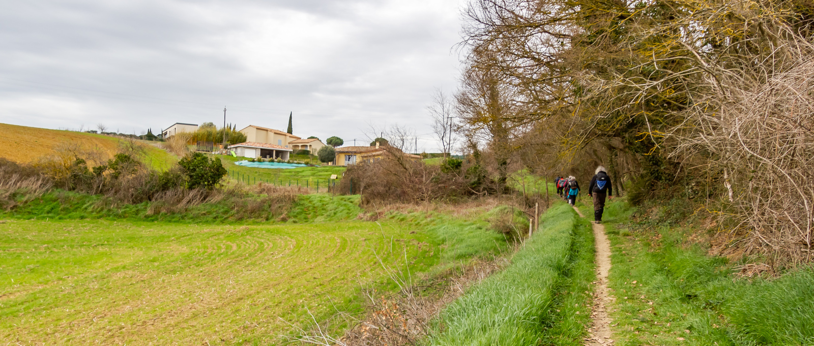 Fin du chemin ND jusqu'à Cère, D94 jusqu'à l'embranchement de Pechantou, chemin de Capdeville, D35c,chemin des Tailladettes, Lambrugal, les Tailladettes, traversée de la D35, En Seriè (chemin de Marsac), chemin des Oustalets, D68E (fréquentée), descente chemin de Cabanes, puis remontée pour traverser la D68E, chemin du Camp Grand.